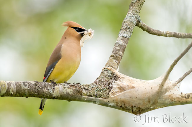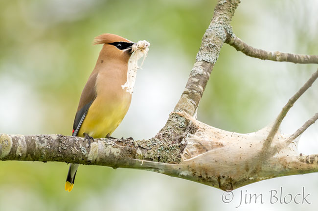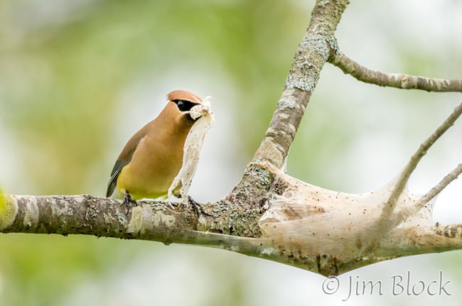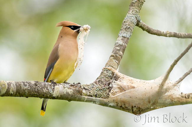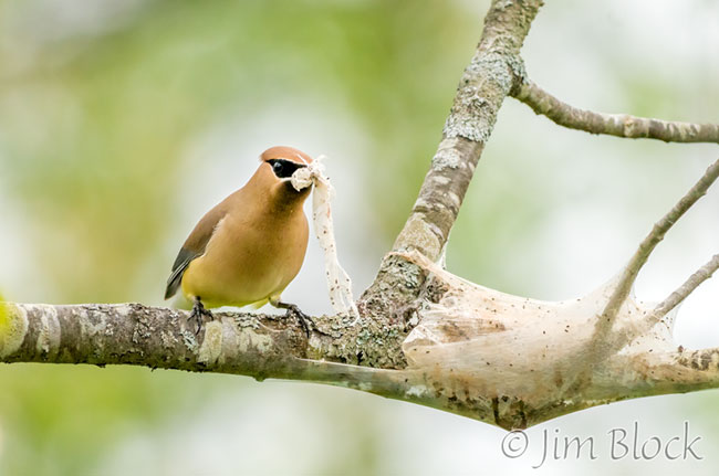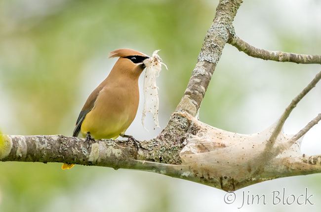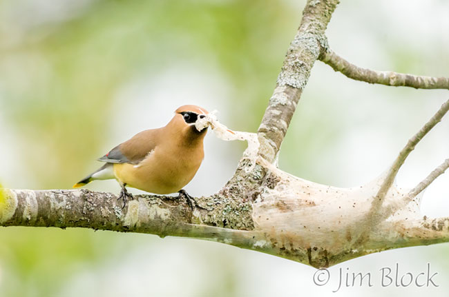 We watched a Cedar Waxwing gathering tent caterpillar webs, presumably for a nest.