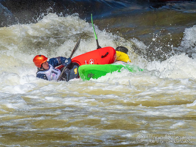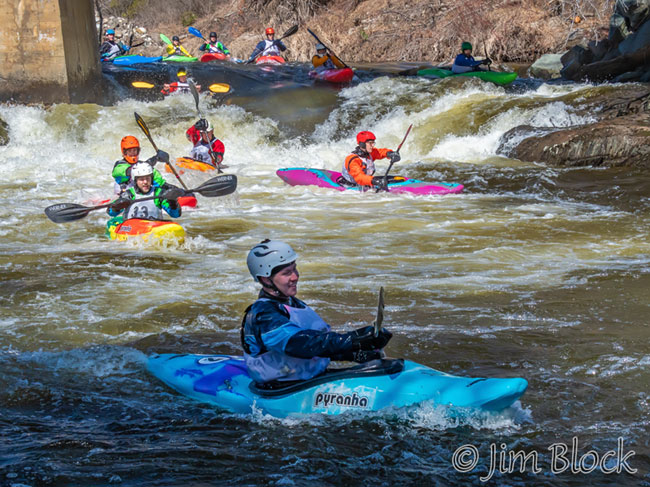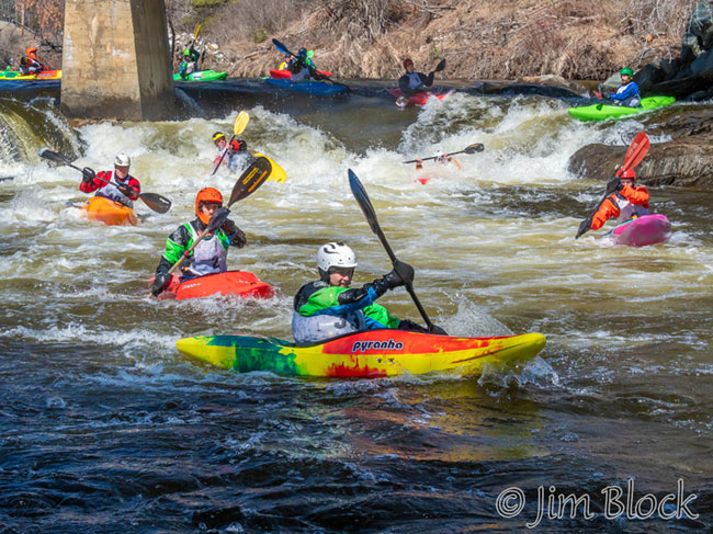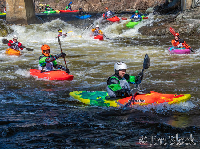 After a long wait, the mass start initiated the melee. It was a bit messy. But somehow, in a short stretch of river, the kayaks got sorted out and took the first drop without too many disasters.