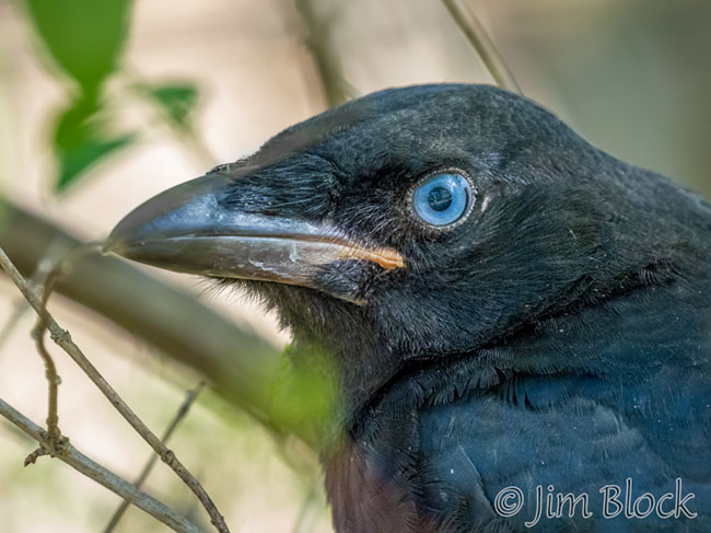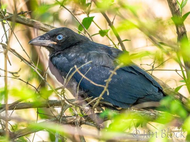 It was “just” an American Crow, but it had a wonderful blue eye, as seen above. I believe the blue eye indicates that this bird has recently fledged and is very young. It sat still for many minutes in dense brush as I slowly approached. It was still there when I left. Here is another photo of my closest-ever encounter with a crow.