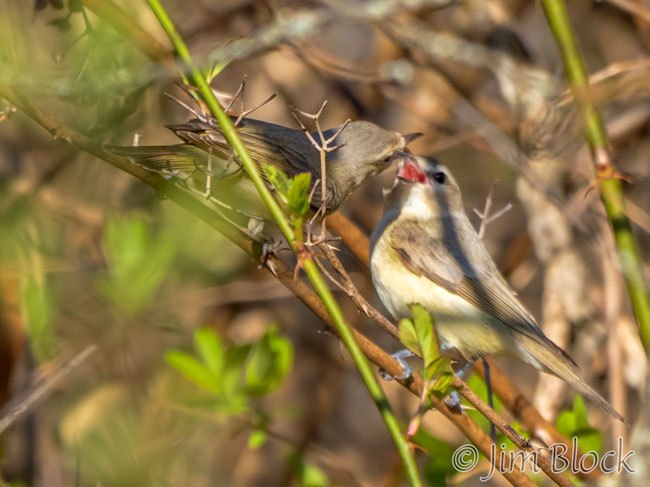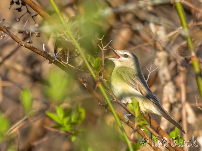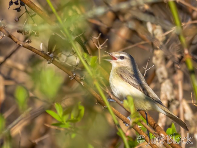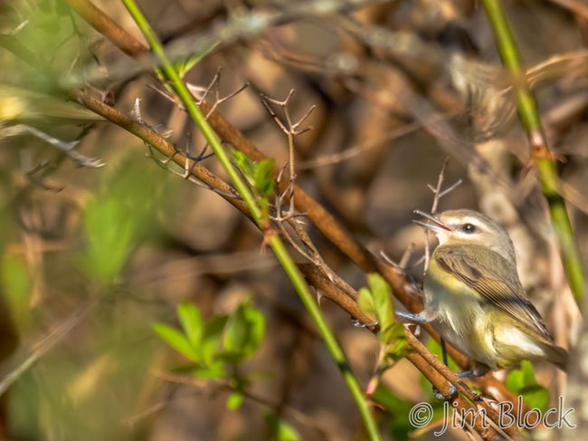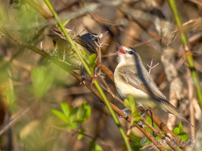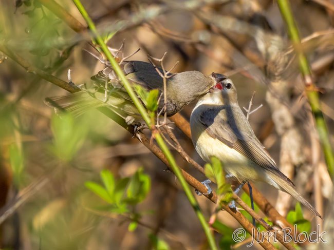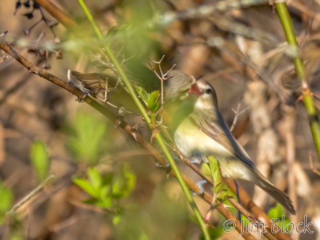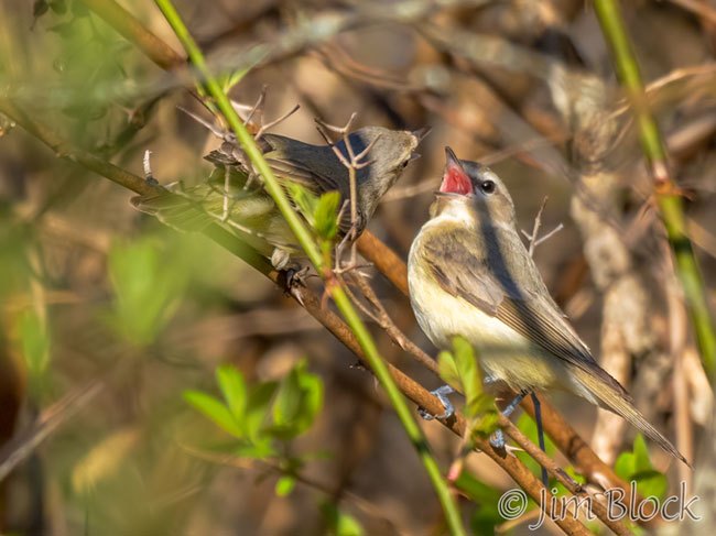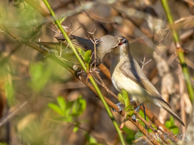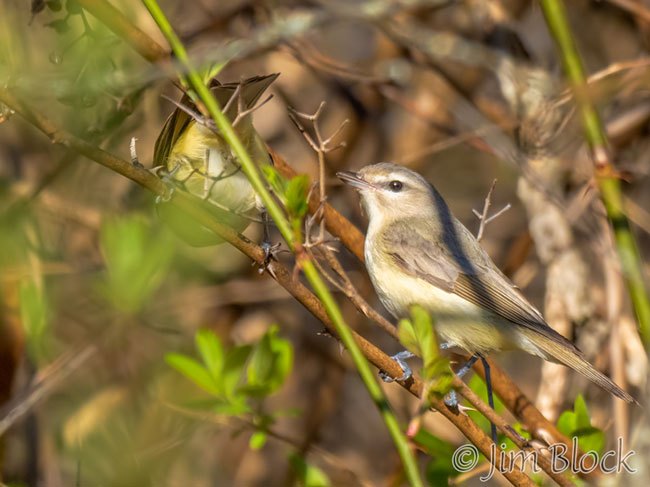 I witnessed a Warbling Vireo pair engaging in prenuptial feeding recently along the rail trail in Lebanon. Unfortunately, they did not do it out in the open where I could get a good look and nice clean photos of both partners. But I was able to snuggle my lens between branches and leaves and capture some of this tender moment.