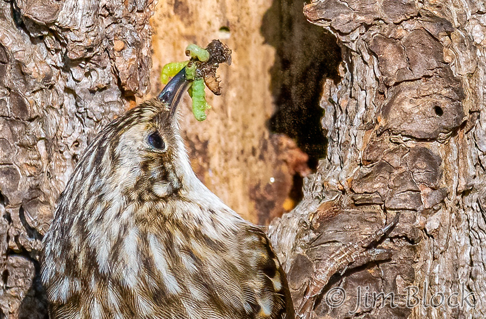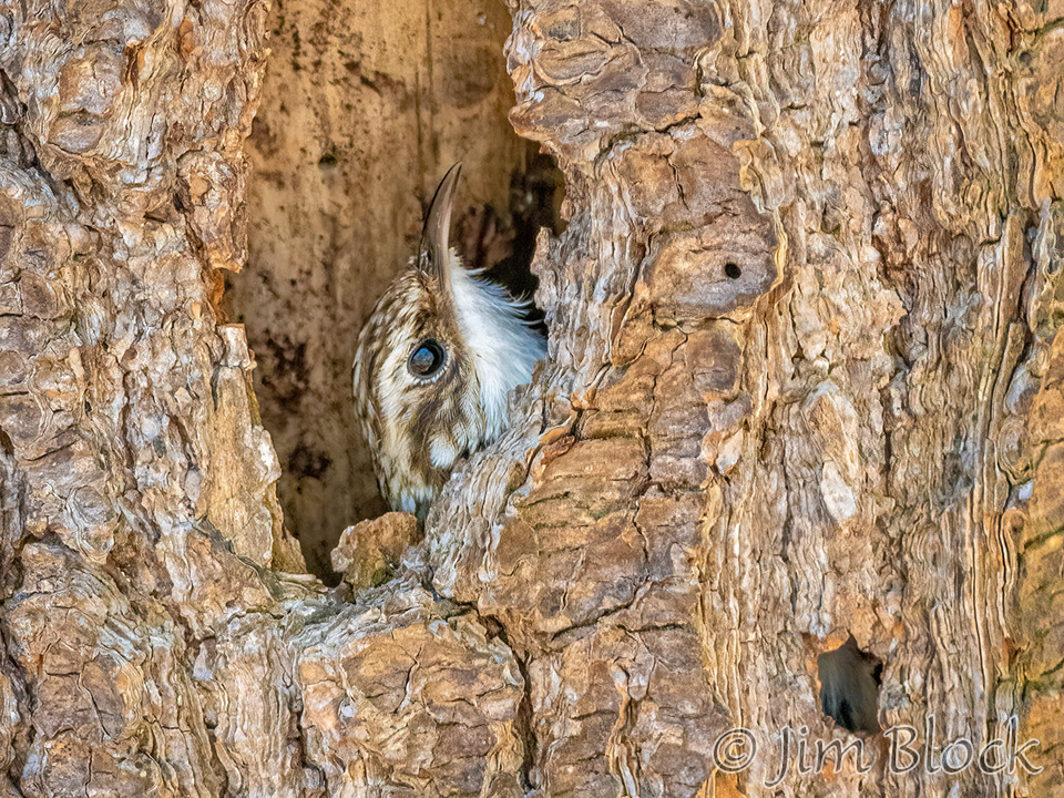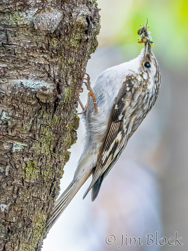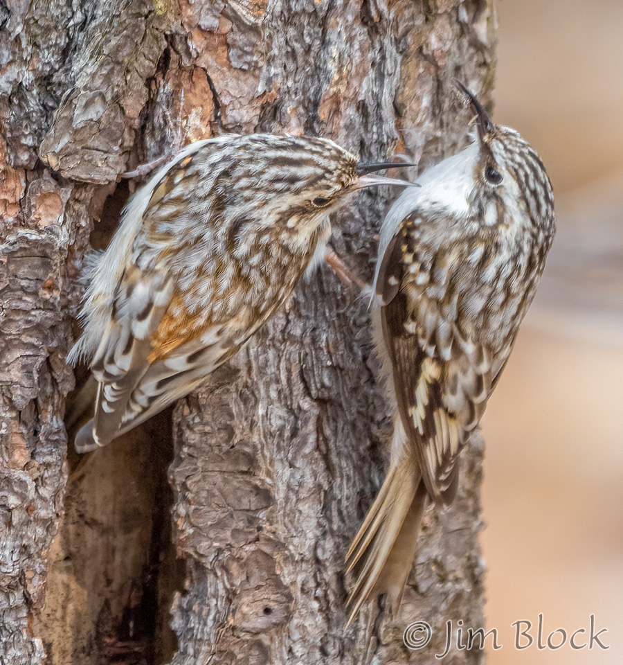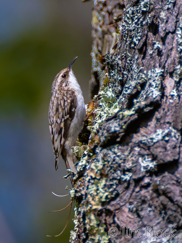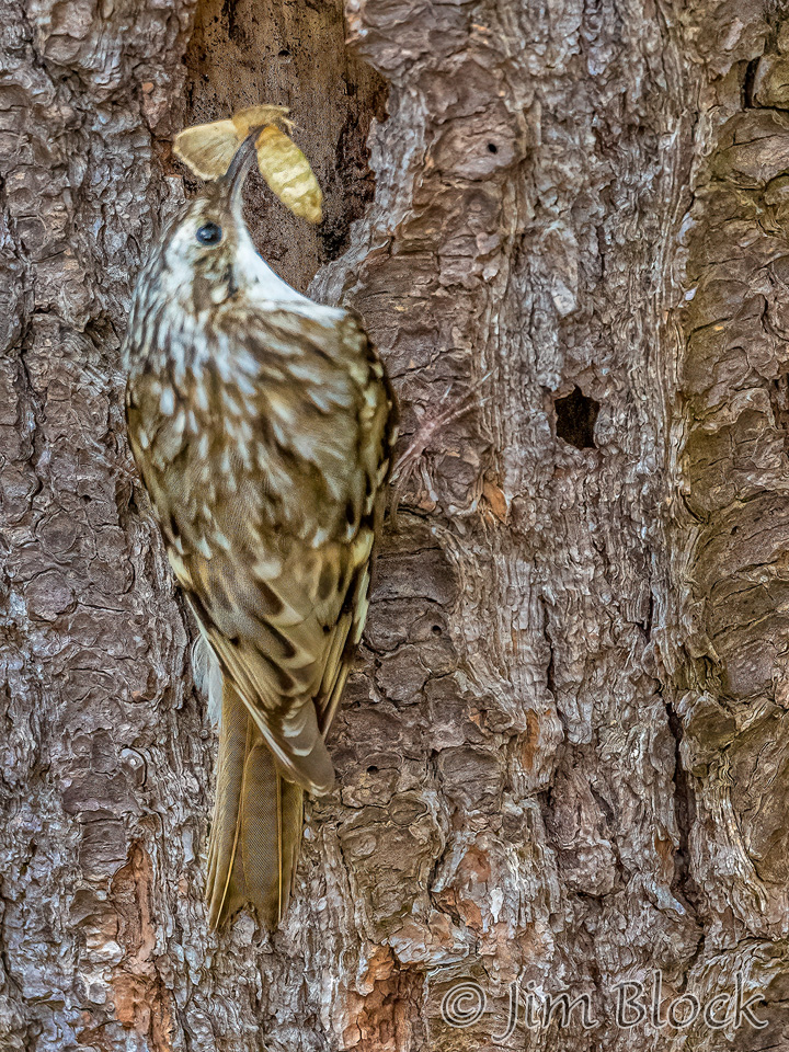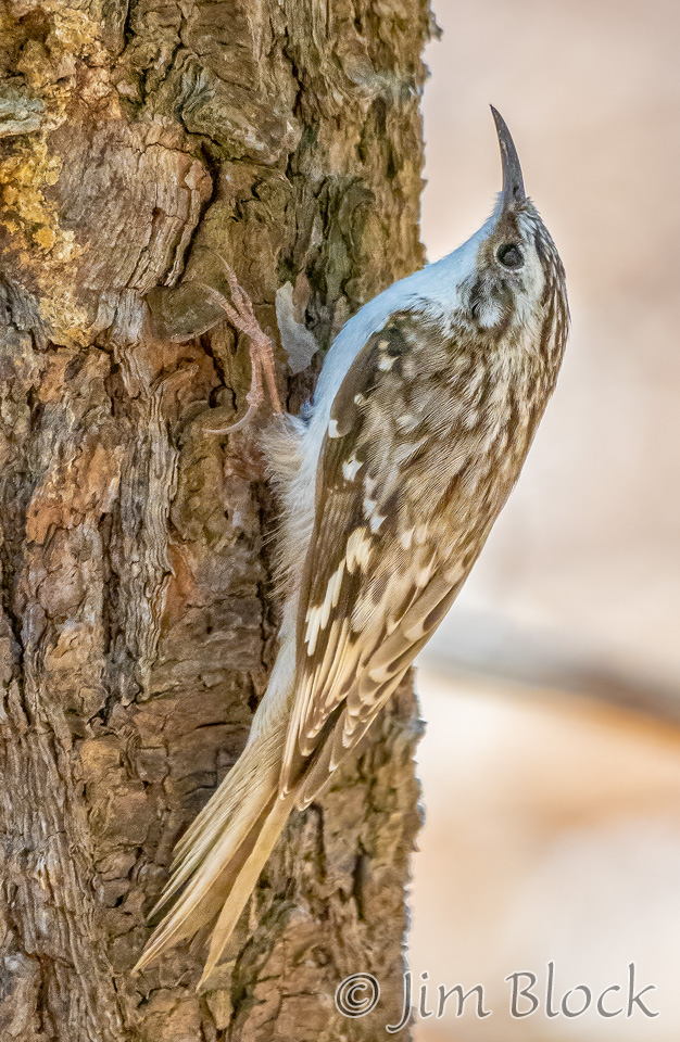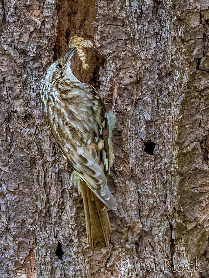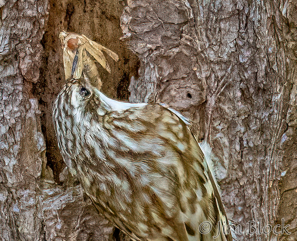 When it finishes with one tree it flies down to the base of another to repeat the process. It then spirals up the trunk in short, jerky motions using its tail for support. But Ted says it better, “Checks crevices for spiders, cocoons, and insect eggs. Slender, curved bill scrutinizes bark like water-witcher scrutinizes the ground, probing, probing, probing. Tail, woodpecker-stiff, braced against the tree. Around and around, always up, nuthatch in reverse, a corkscrew search for food.”