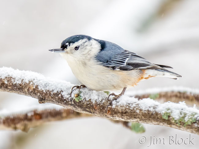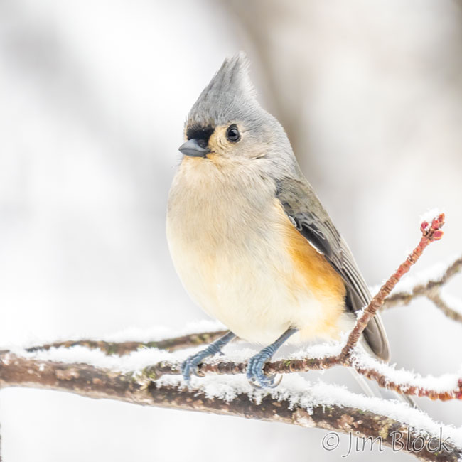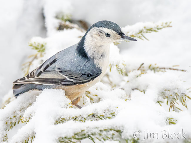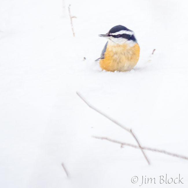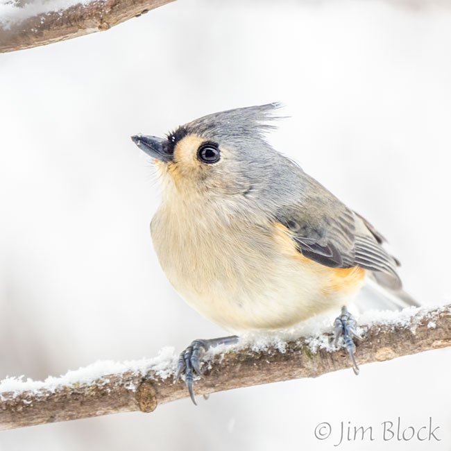 Here is a collection of four common birds in the snow on January 2nd: chickadee, tufted titmouse, red-breasted nuthatch, and white-breasted nuthatch.