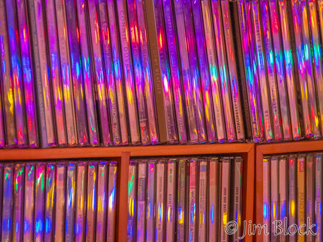 Even though nobody but us would see it, we again erected a small artificial tree with colored lights. Jann alerted me to the reflection of those lights in our enduring collection of CDs, as seen above.
