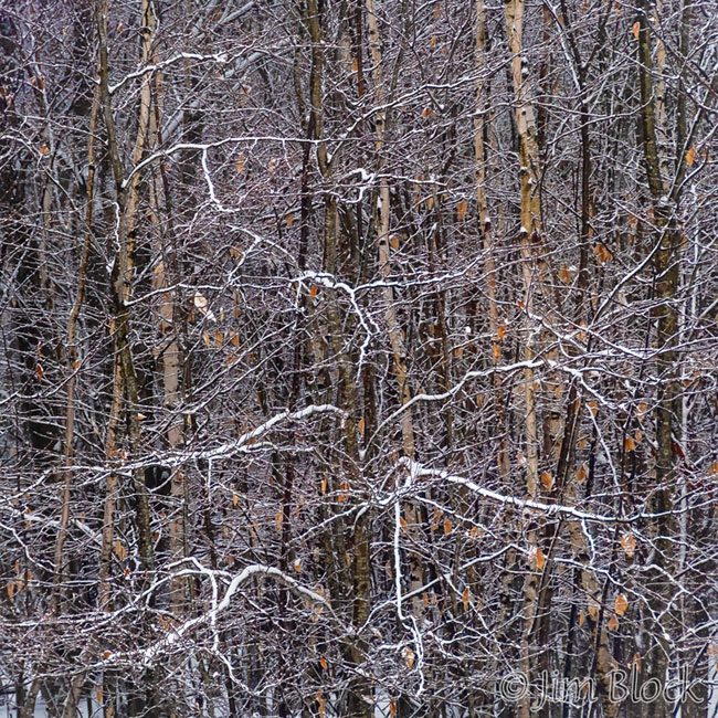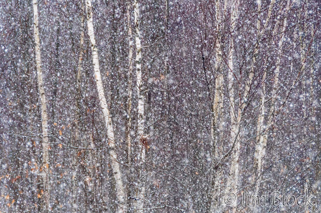 We got some snow flurries December 28. They didn’t amount to much, but they did make an interesting pattern falling with a background of white birch.