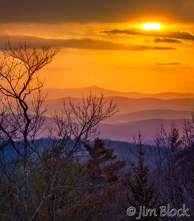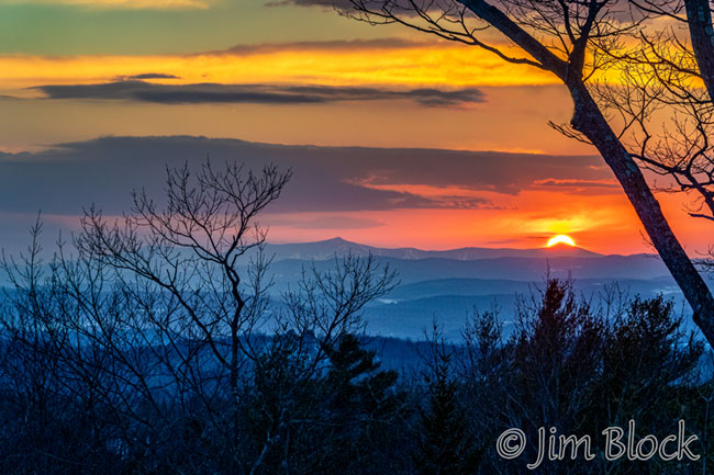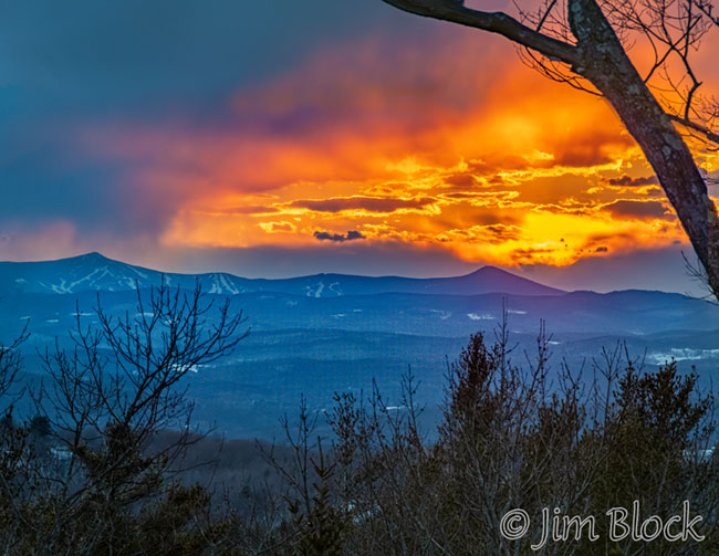 Below, not even half way to the Summer Solstice, the sun is already setting behind Pico on March 11. In this photo Killington is in the center and Okemo is off the image to the left, about four times as far from Killington as Pico is.