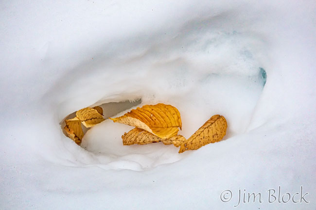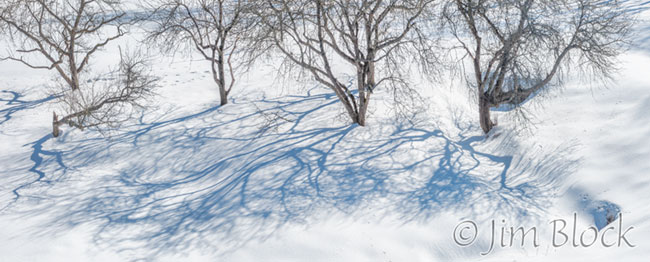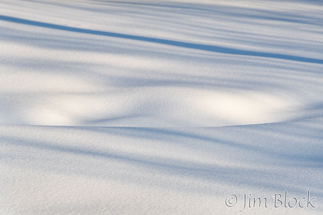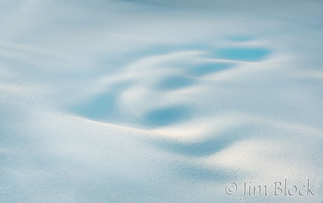 Later in the afternoon when the sun is low and bright, shadows abound and dominate the subtle hues and shapes in the snow.
