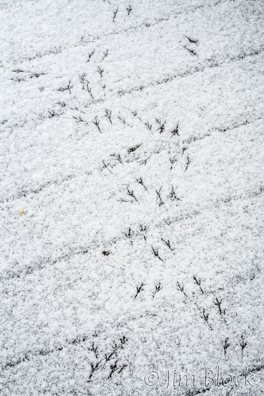 This early spring was unusually warm, but on April Fool’s Day we had a bit of snow. You can see bird tracks on our deck and the snow falling on a crow.