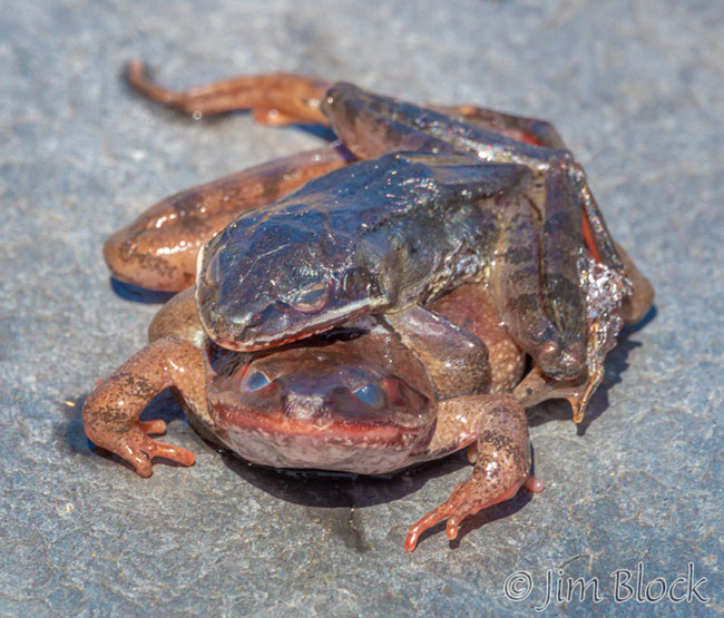 I found a pair of wood frogs dead in our yard. It appeared they might have died while mating. I sent this photo to Mary Holland, and she replied, “I guess the wood frogs died in the throes of reproducing, as that’s a male on top and a female on the bottom, and they are in amplexus, or their mating positions…at least they died happy! ? “