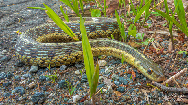 Jann and I came upon a Garter Snake while we hiked. It was cold so the snake was quite still, waiting for the sun to warm it up. I took this photo very close up with a wide angle lens.