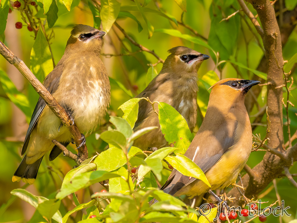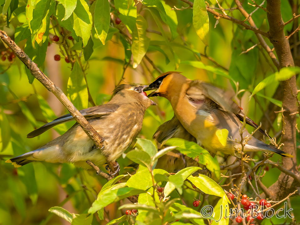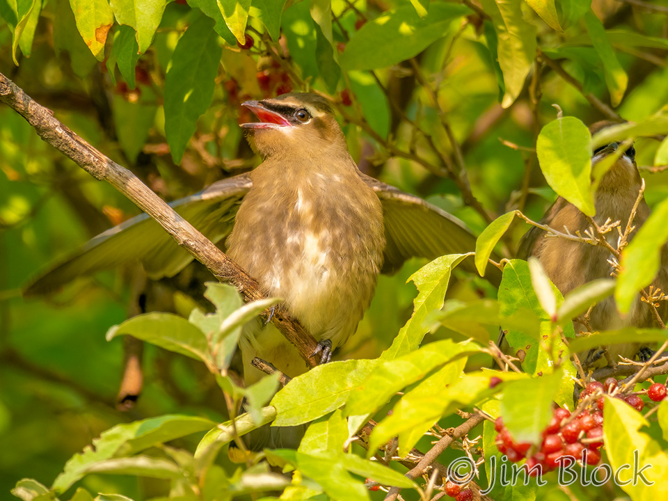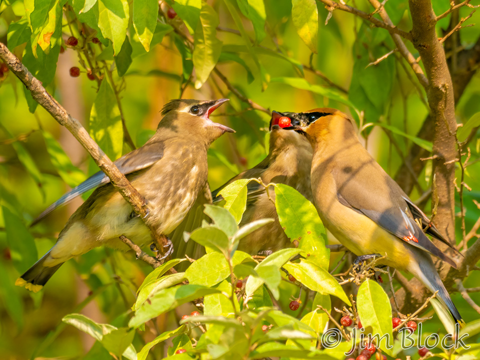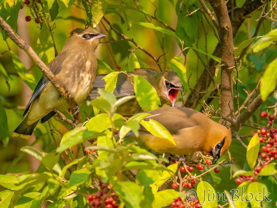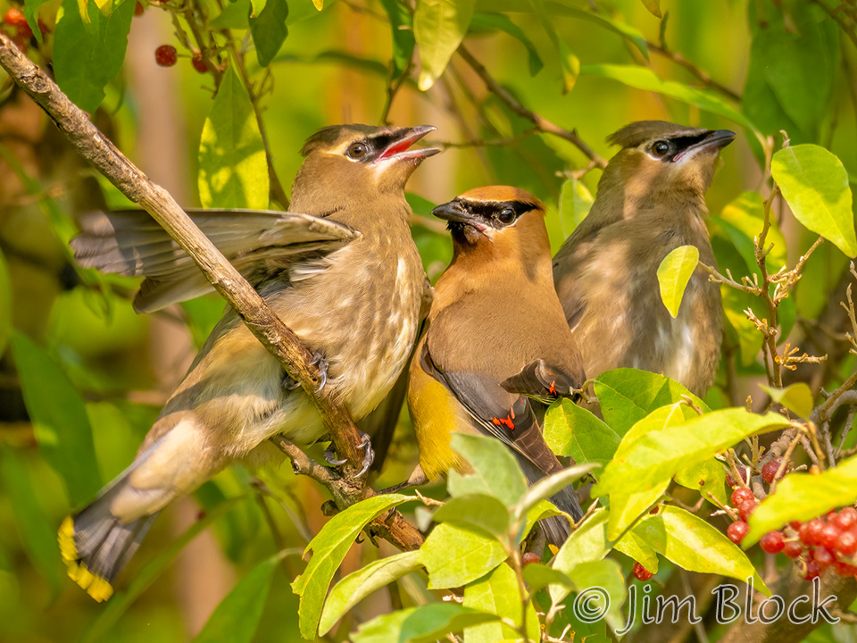 The striped immature waxwings are certainly old enough to feed themselves. But, like many kids, they seem to prefer to be fed by their parent. Here is a pair begging and receiving some red Winterberries (Ilex verticillata).