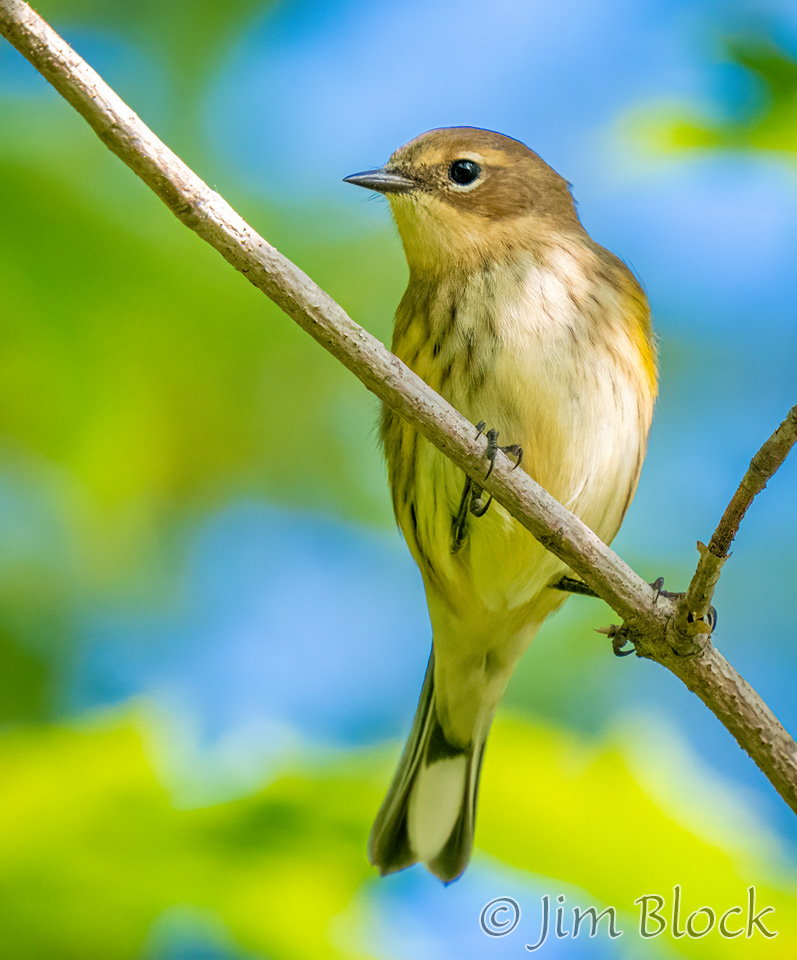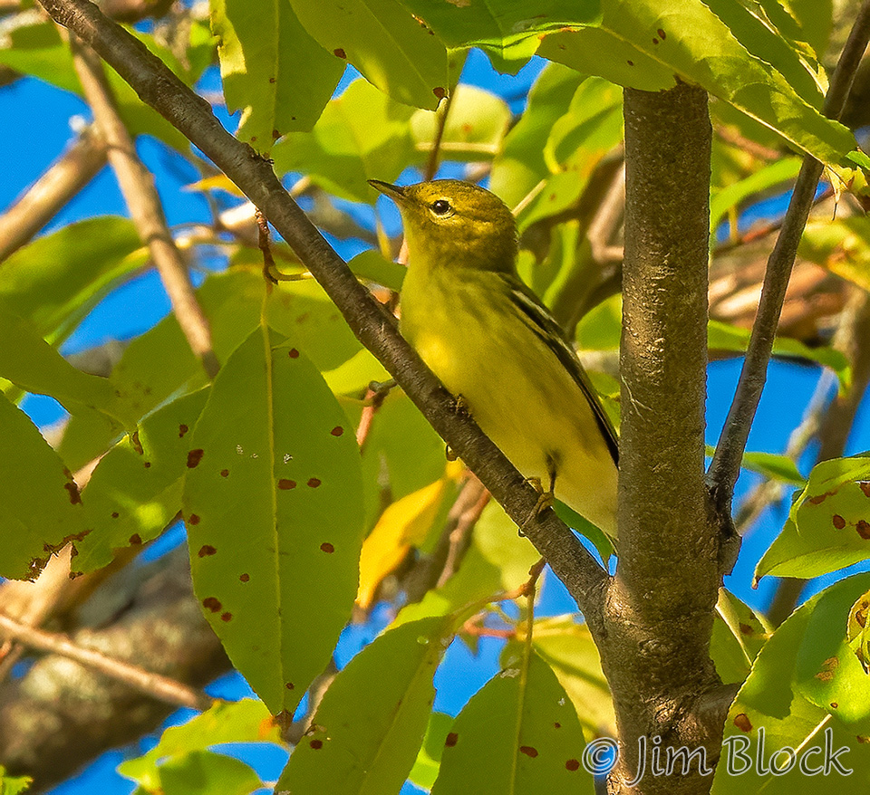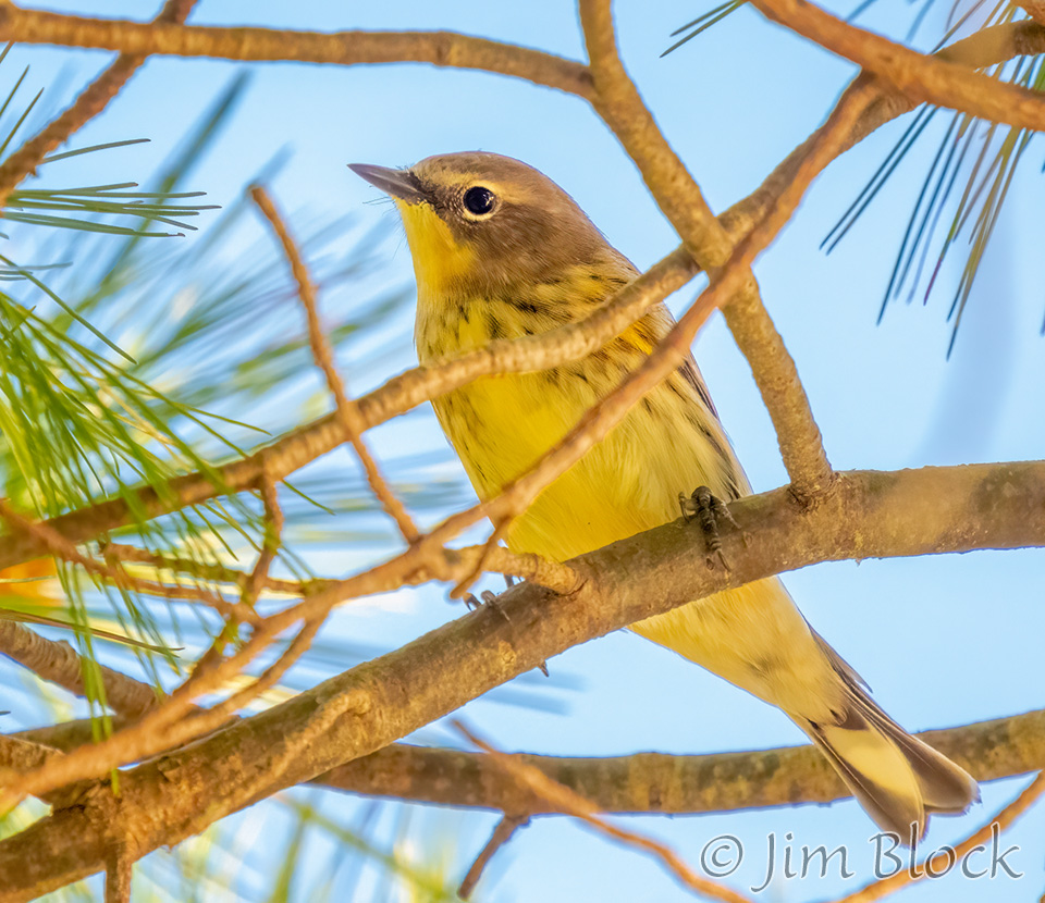 While sitting on my porch reading, I caught movement in the nearby trees. A flock of warblers was moving quickly through. Among them was at least one Pine Warbler.