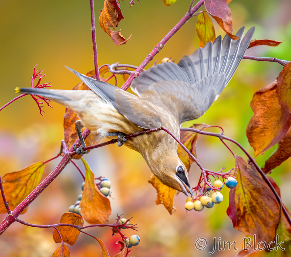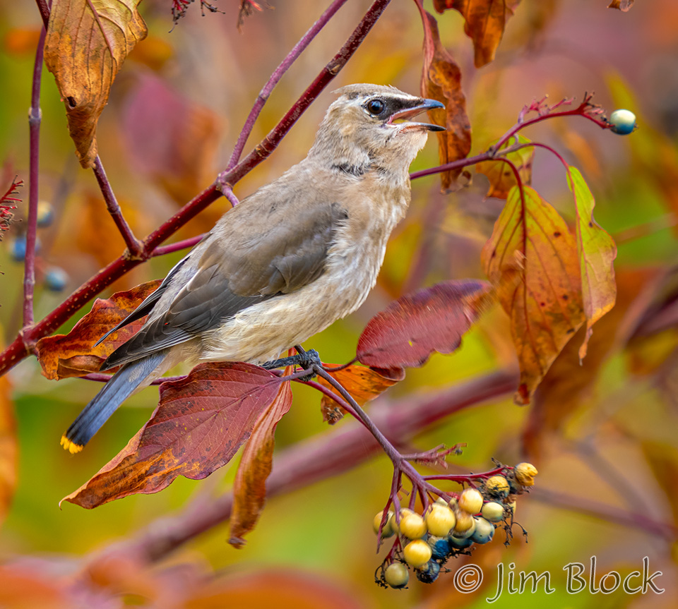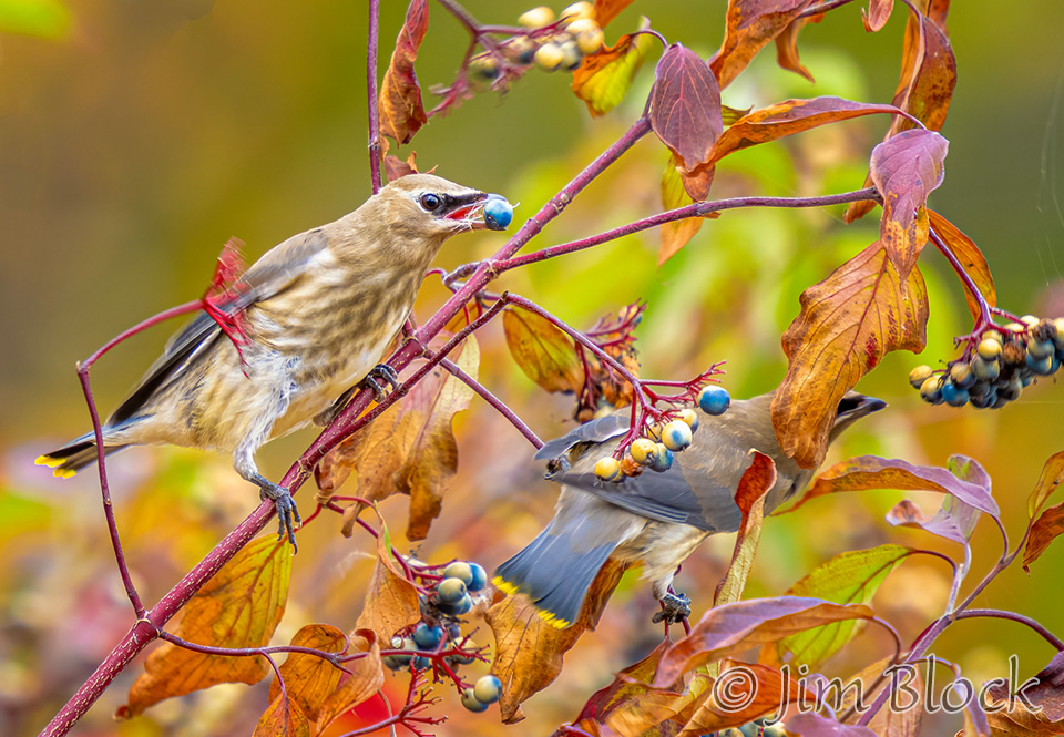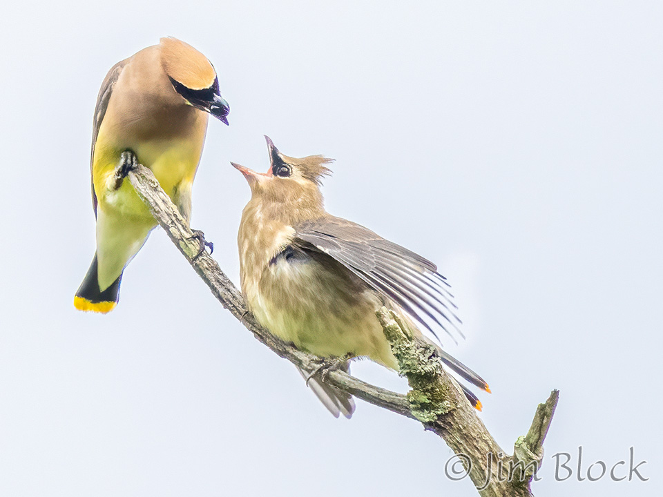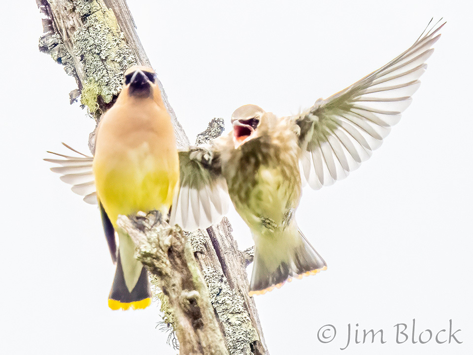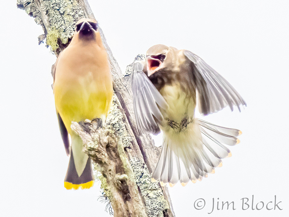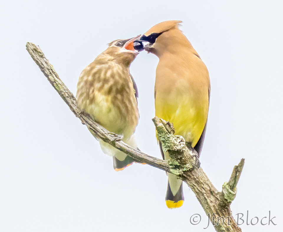 At Campbell Flat in Norwich I photographed juvenile Cedar Waxwings getting fed small dark berries.