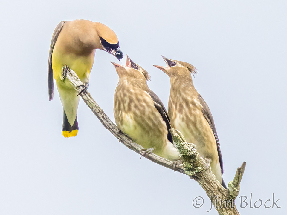 Cedar Waxwings Feeding Young and Themselves