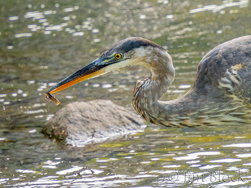 It walked from backlit sun to the shade of the bridge and caught another crayfish. But it did not seem to want to swallow it so it tossed it back into the river.