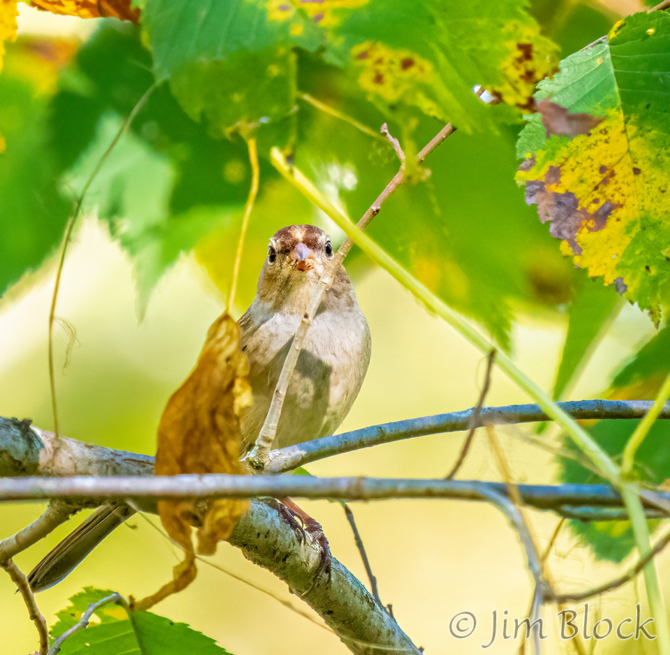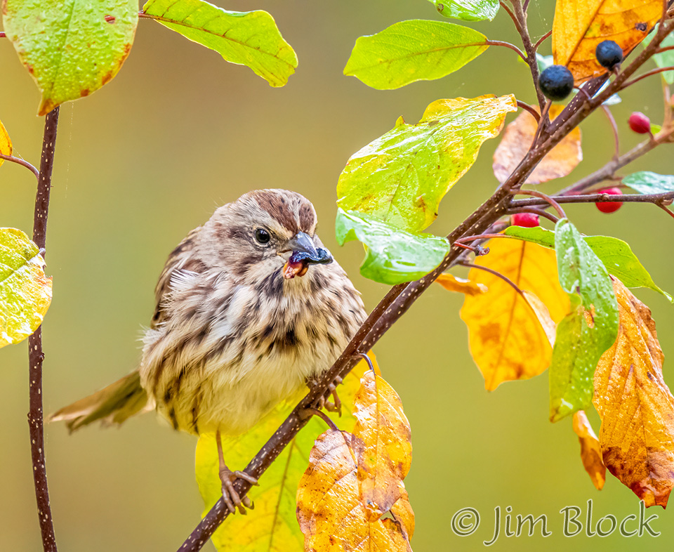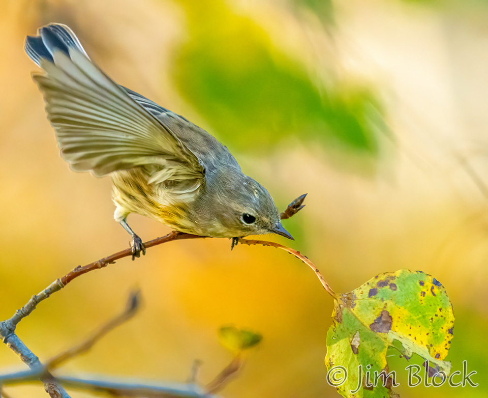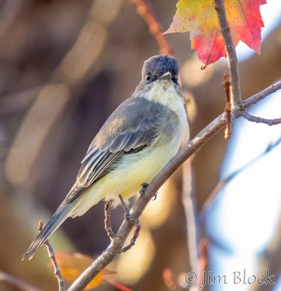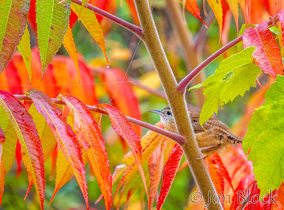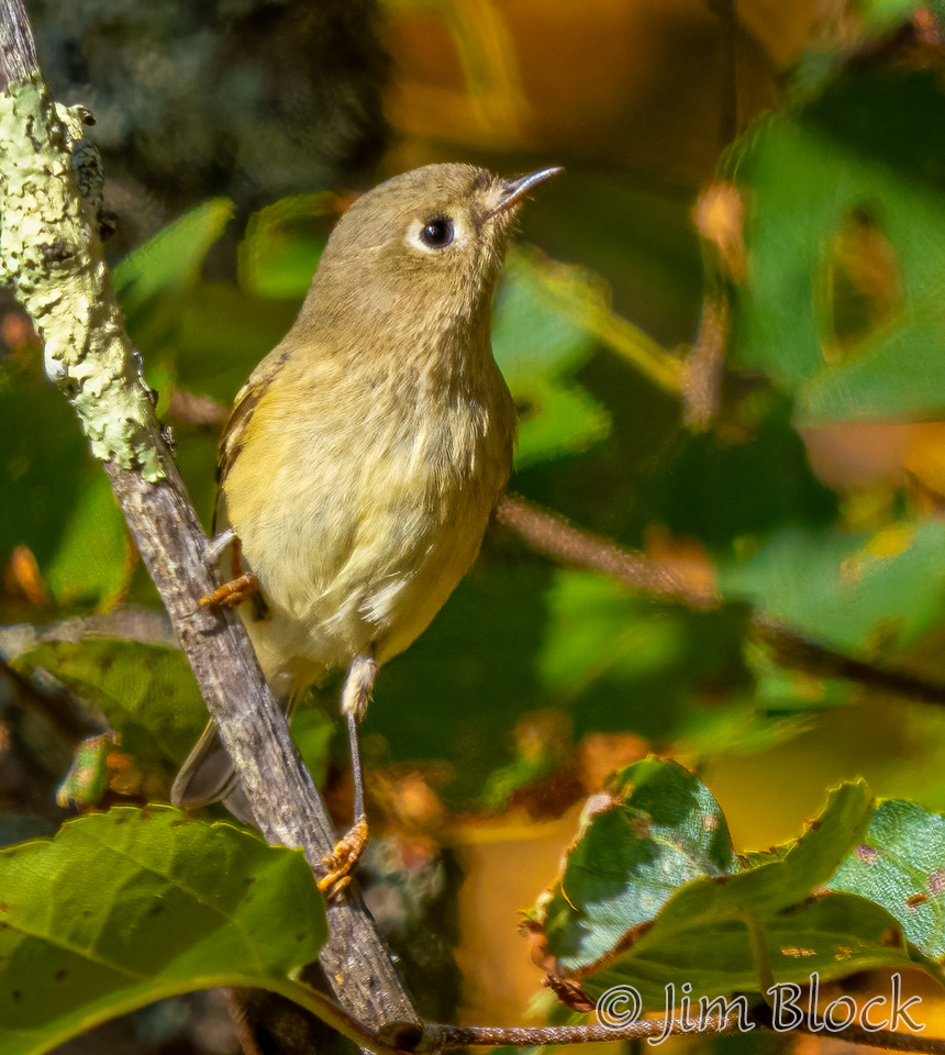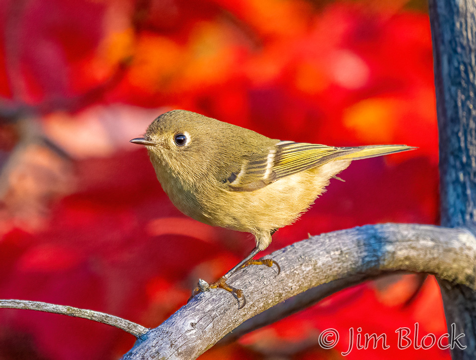 This time of year the birds have molted to mostly drab colors, but the trees are presenting their colorful fall spectacular. Earlier in the season the birds were plentiful but hard to see in the lush green leaves. Soon the trees will be bare and the birds will be easier to see, but there will be many fewer of them. This transitional season provides a unique opportunity to see and photograph birds in colorful foliage like the Ruby-crowned Kinglets above at Mill Pond in Etna on October 7 and below in our yard on October 14.
