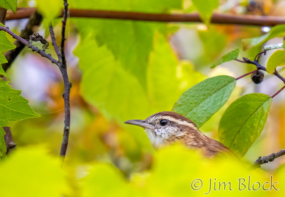 While taking the catbird photo above, I heard loud singing by an easy-to-recognize — even by me — Carolina Wren. It repeatedly advertised its presence and was relatively easy to photograph as it moved through the shrubs along the Greenway.