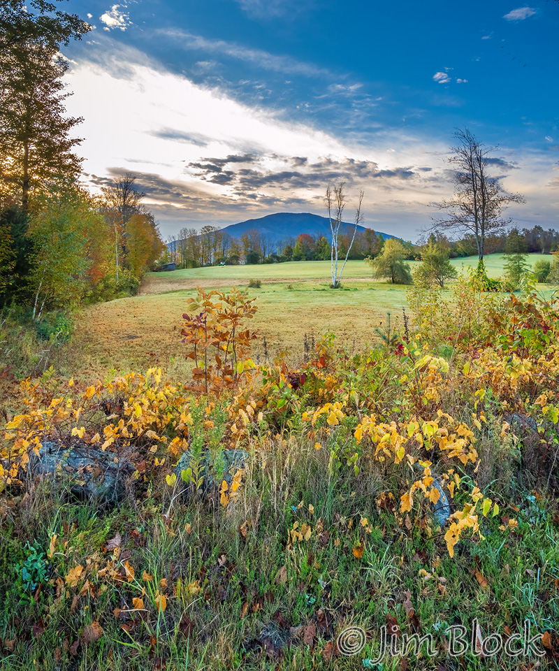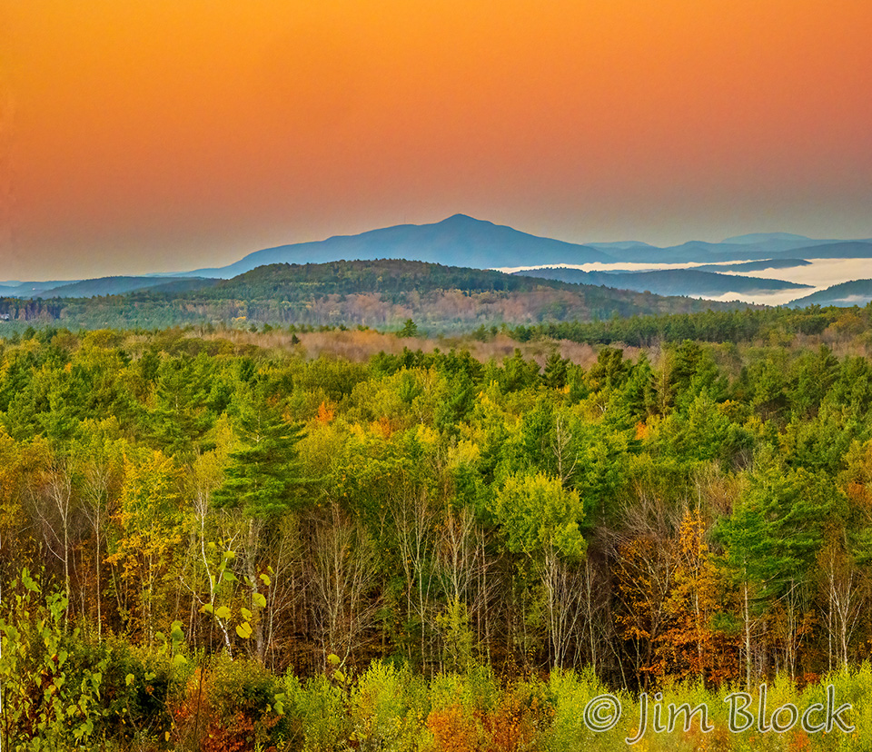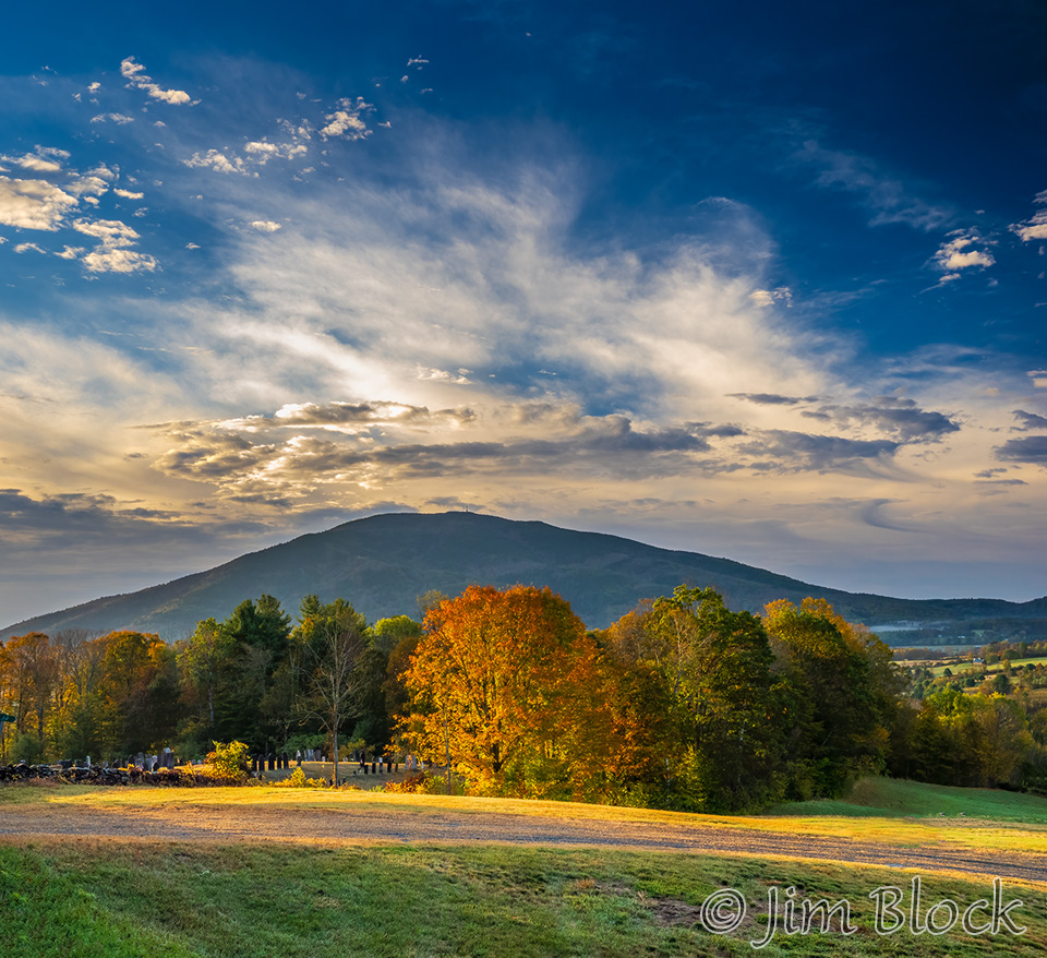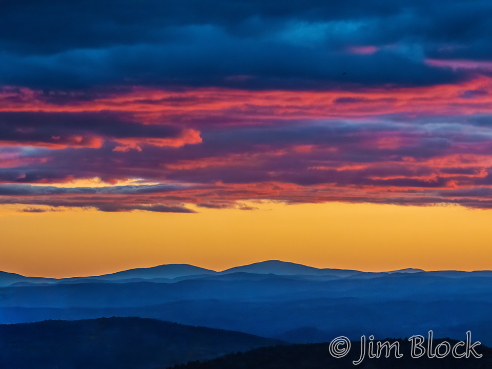 I missed a glorious sunset when I was exhausted from a foliage trip to the Northeast Kingdom. But I did get this one over the Vermont mountains. The peak near the center of the second photo is Ludlow Mountain which is sometimes called Okemo after the ski area.