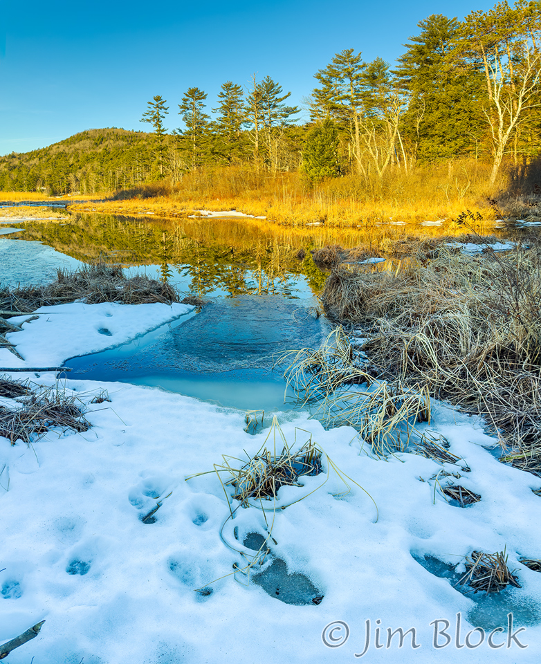 Clay Brook in Lyme was open though nearby Post Pond was still covered with something white on March 11. There were mammal tracks in the snow.