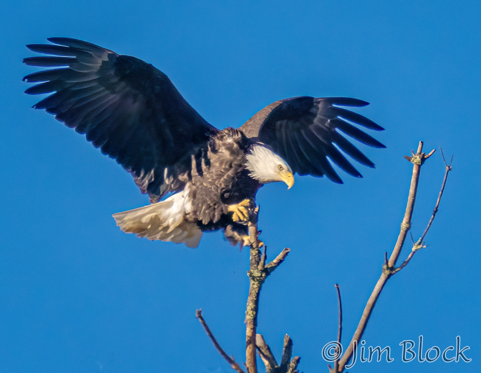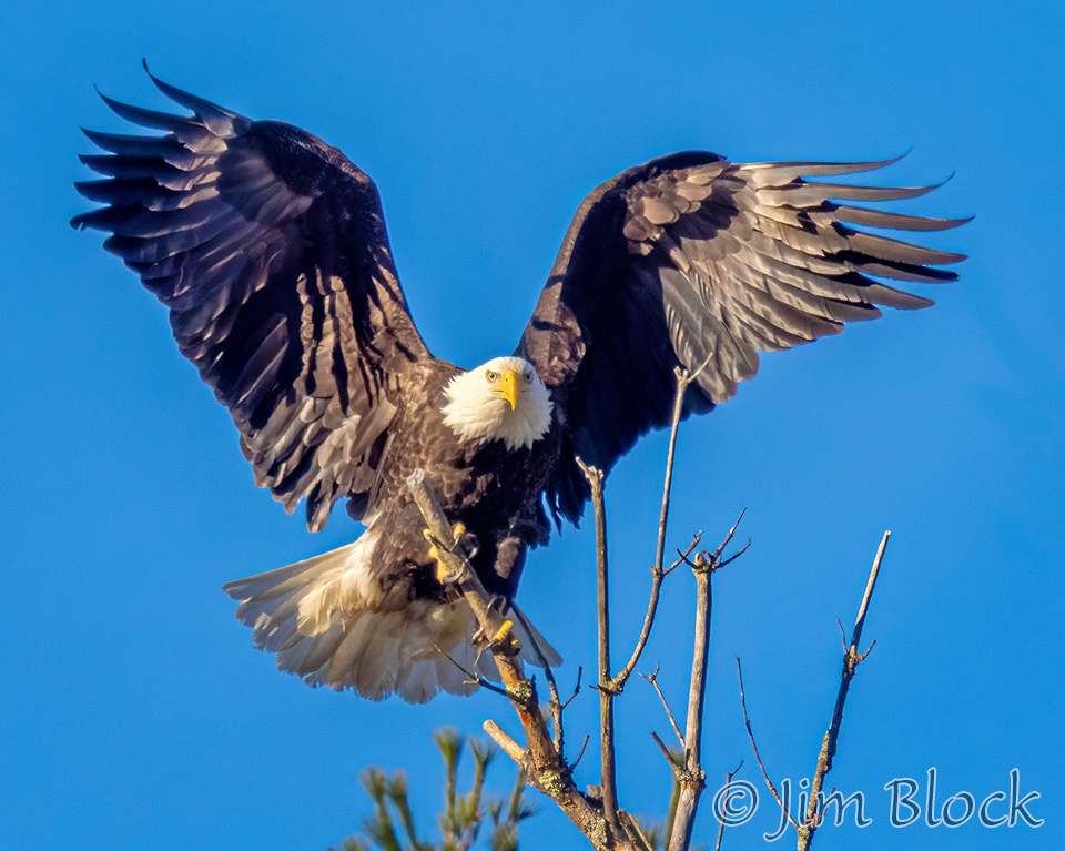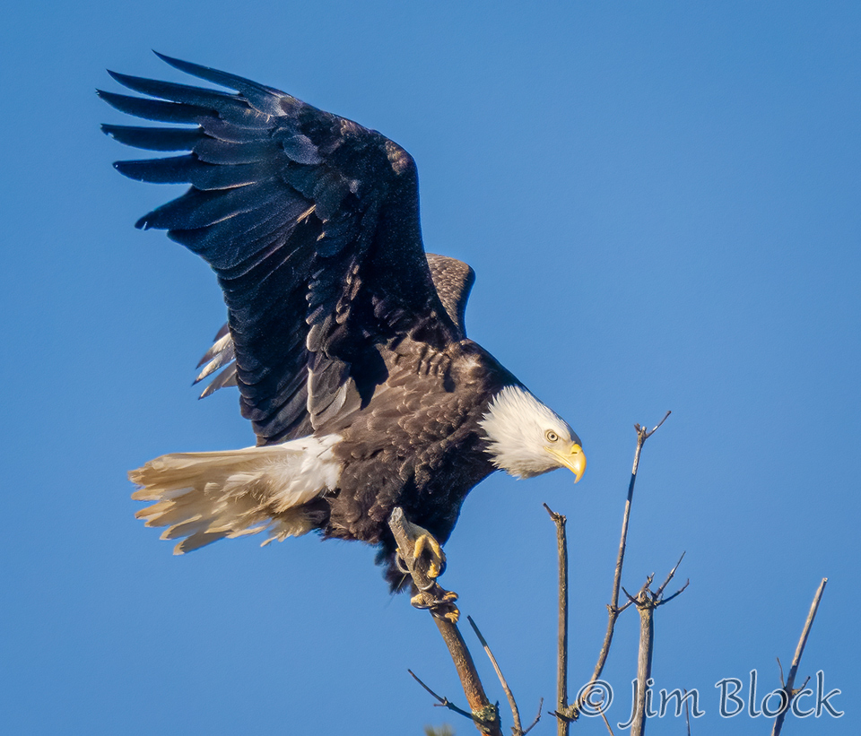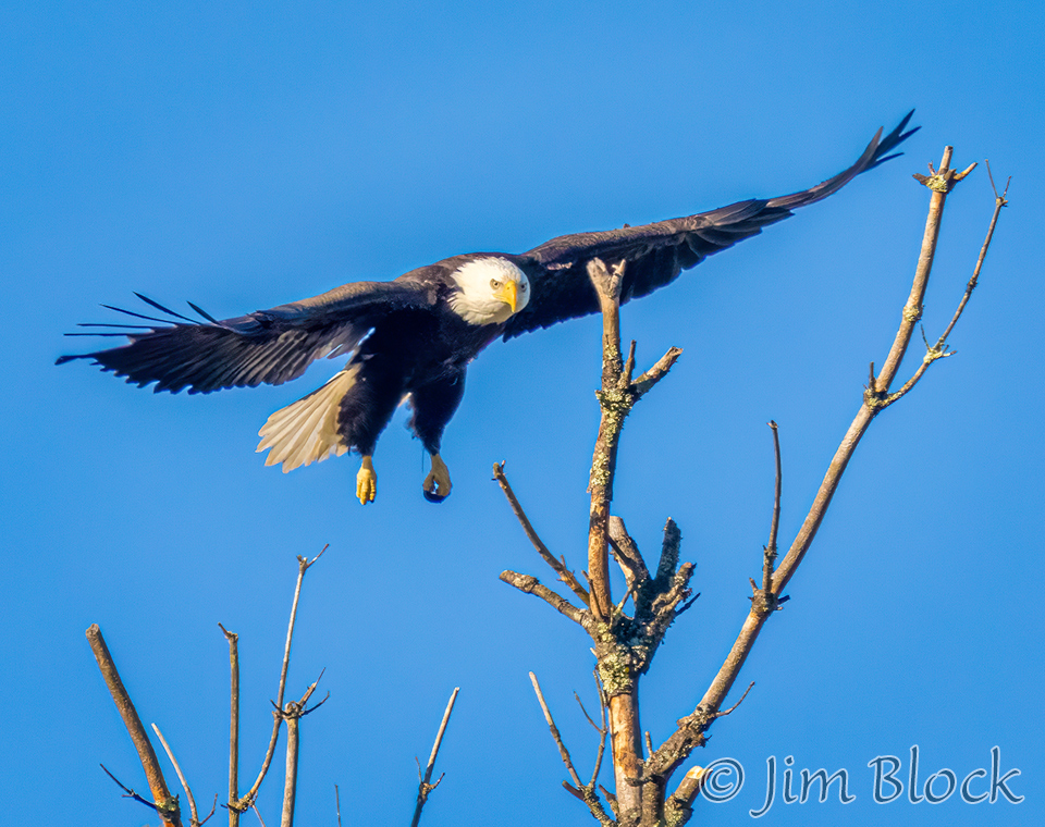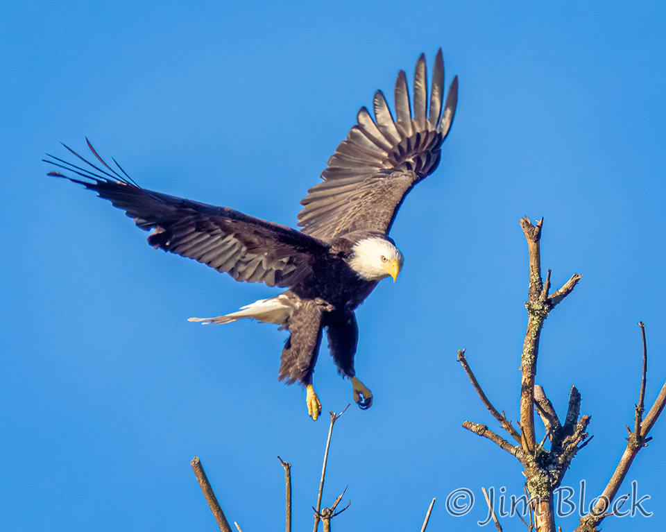 This sequence shows an eagle landing on the top of a dead tree. It landed on a slightly different branch than it looks like it was heading for in the first two photos.