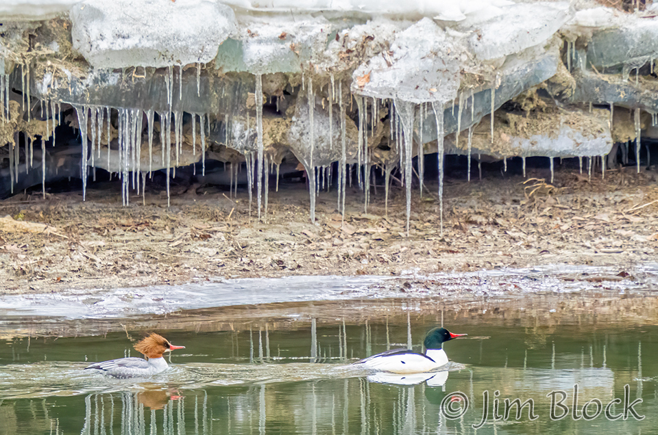 On March 21 the ice kept the channel of the Ompompanoosuc River fairly narrow, so the mergansers were not too distant.