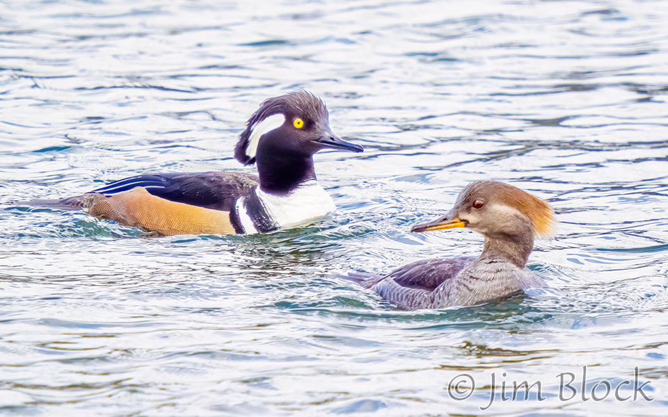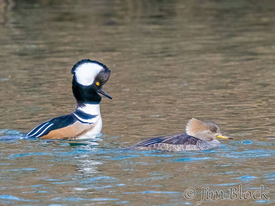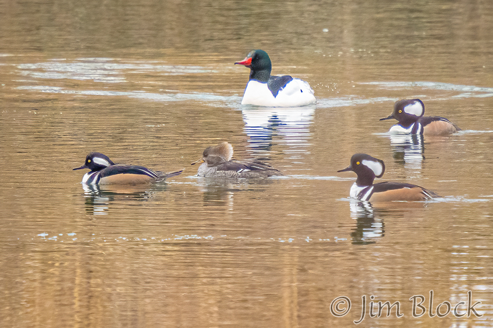 Male hooded merganser look quite different than common merganser. Here is a comparison with a single hooded female also in the mix.
