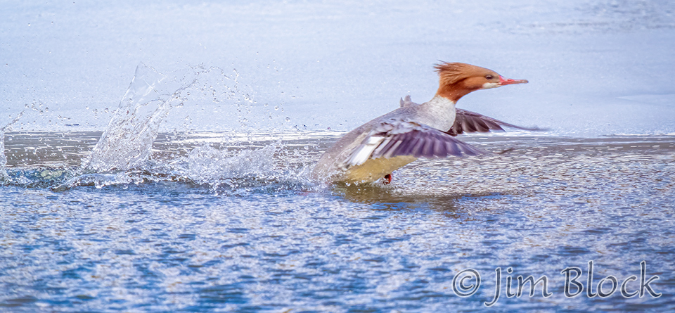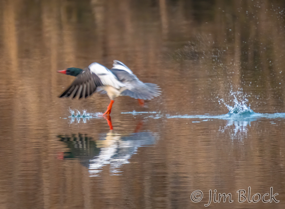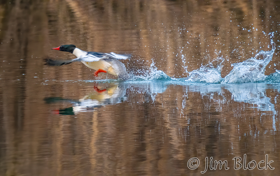 I photographed a male taking off from the Ottaquechee River in Quechee, VT. They are heavy birds so they run on the surface of the water like loon as they struggle to get airborne.