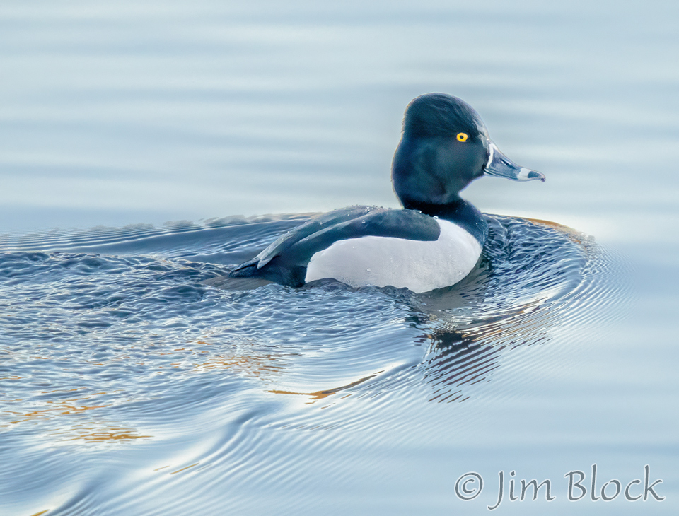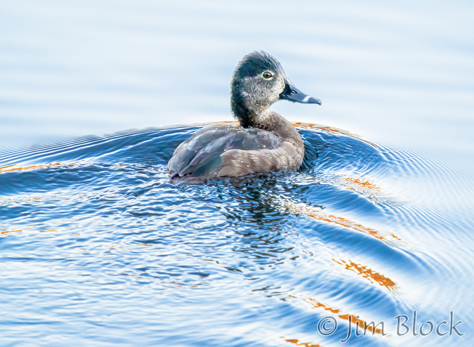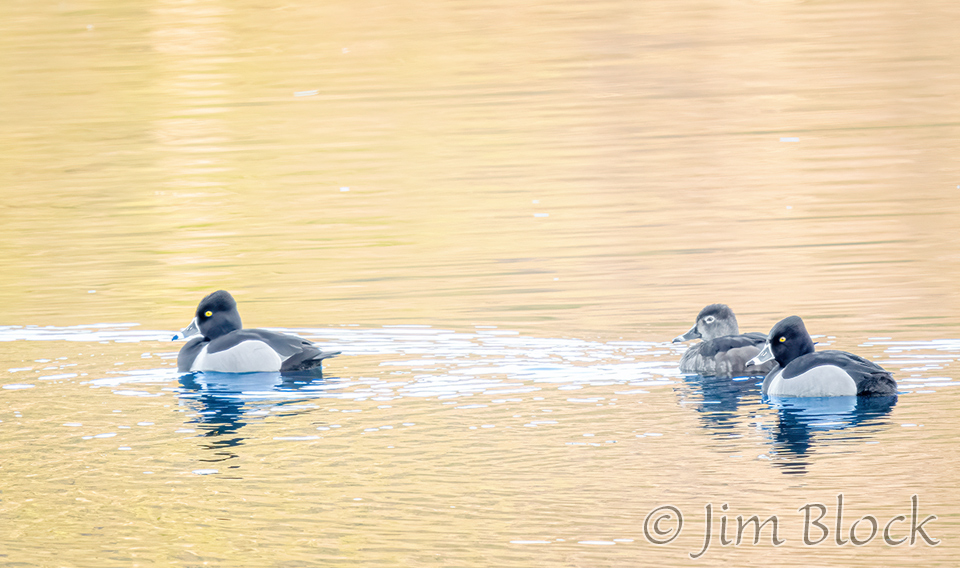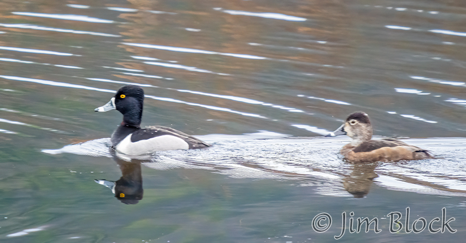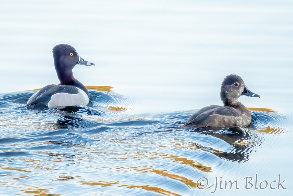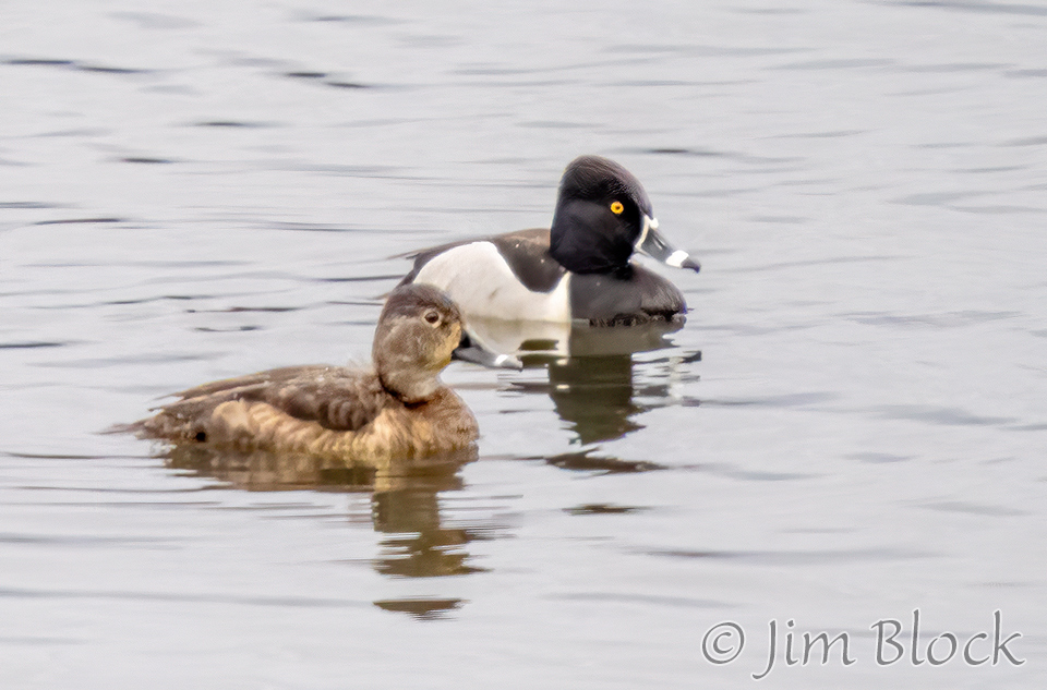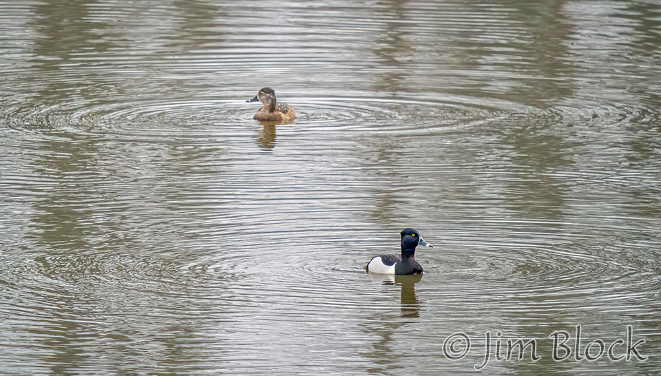 The Ring-necked Duck should be named the ring-billed duck, since the ring on the neck is hard to see while the bill has a distinctive ring.  Here are a pair in the Connecticut River from East Wilder on a dull morning.