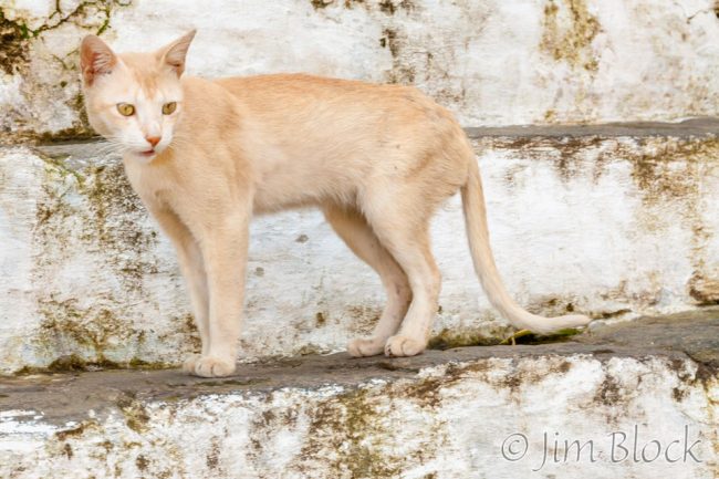 Crossing the bridge to the dzong I got a photo of a Common Myna. A cat guarded the entrance steps.