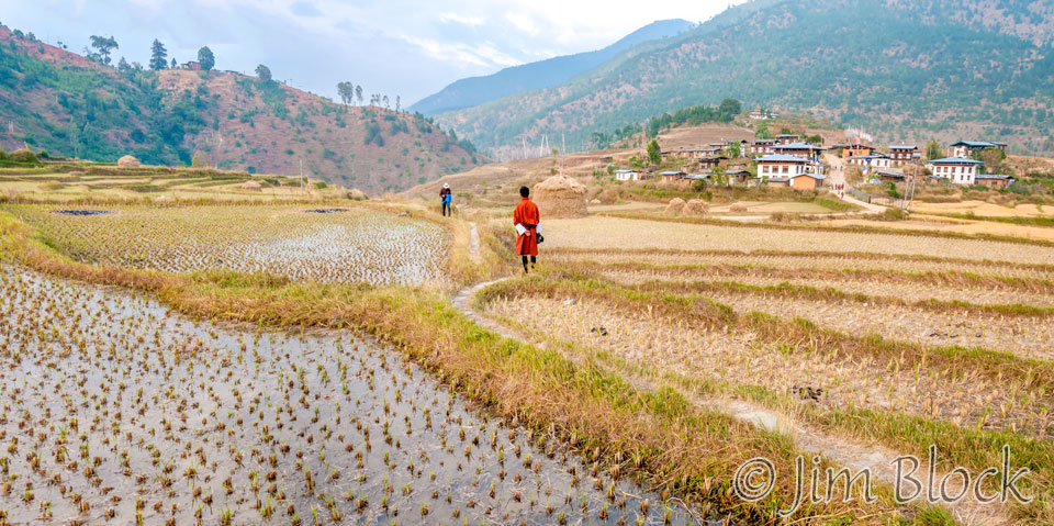 This 8-shot panorama shows the fields at Yambesa Punakha and the valley looking back toward Punakha. You can explore this image in detail. You can double click once or twice or three times to zoom way in and use the left mouse to pan around. You can also use the + and – keys to zoom and the arrow keys to scroll. Please wait for the resolution to download.