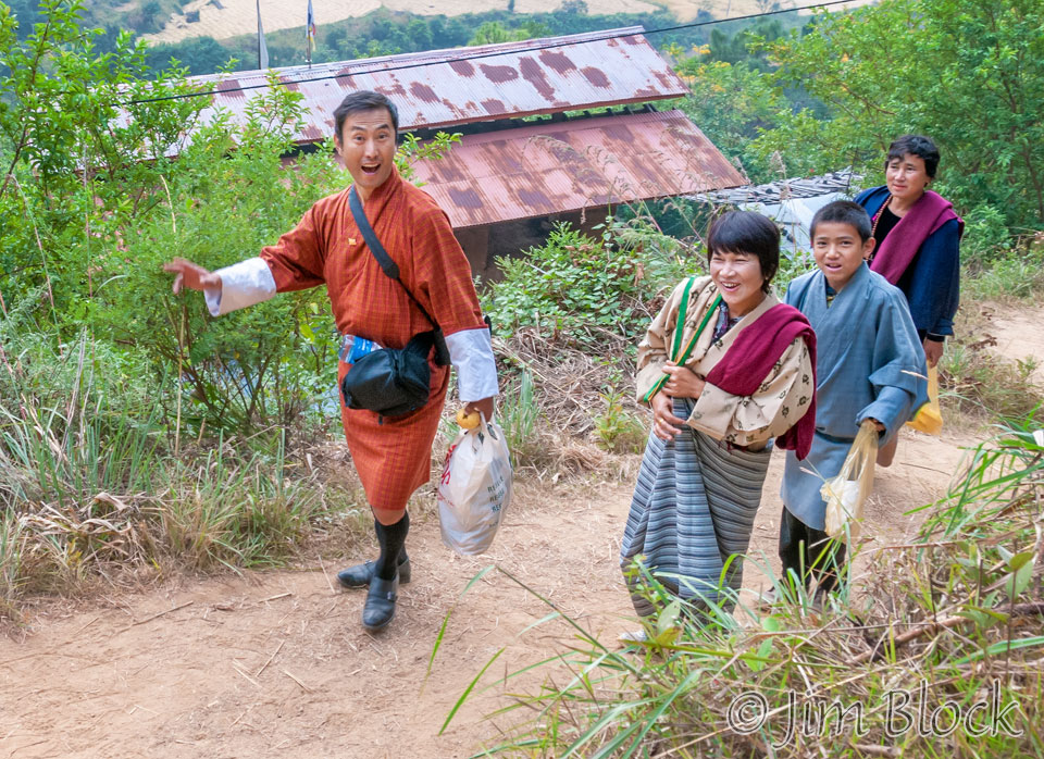 I brought several Hanover Coop grocery store plastic bags with me on the trip. These heavy duty bags come in handy as a rain hood for cameras and for many other emergency uses. I gave one to Lakey this morning so he could continue his unrelenting campaign to free Bhutan of litter. He easily filled the large bag on our trip up to the temple. Here he is walking with two women and a young boy who visit the temple to pray very often.