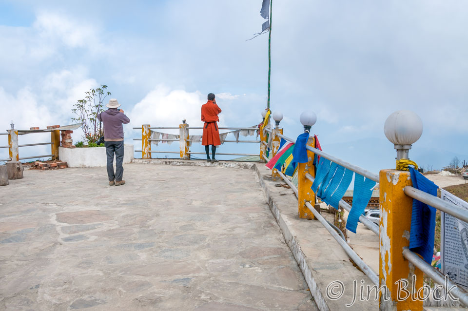 Reportedly the terrace had a great view of the mountains of Bhutan. Unfortunately the clouds did not cooperate. Here Stephen and Lakey attempt to get some photos.