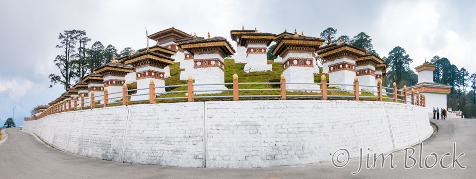We stopped briefly at Dochu La and the 108 chortens. We were now over 6200 ft above Punakha. 108 is a sacred number to the Buddhists. This somewhat distorted view is a 3-photo panorama.