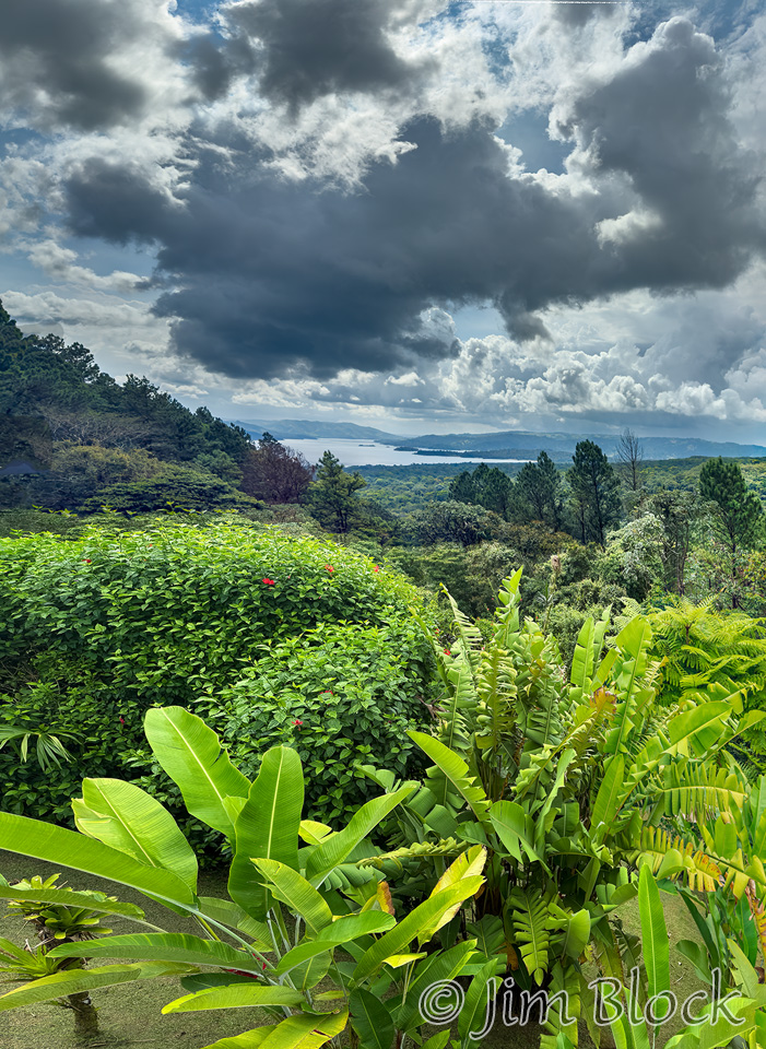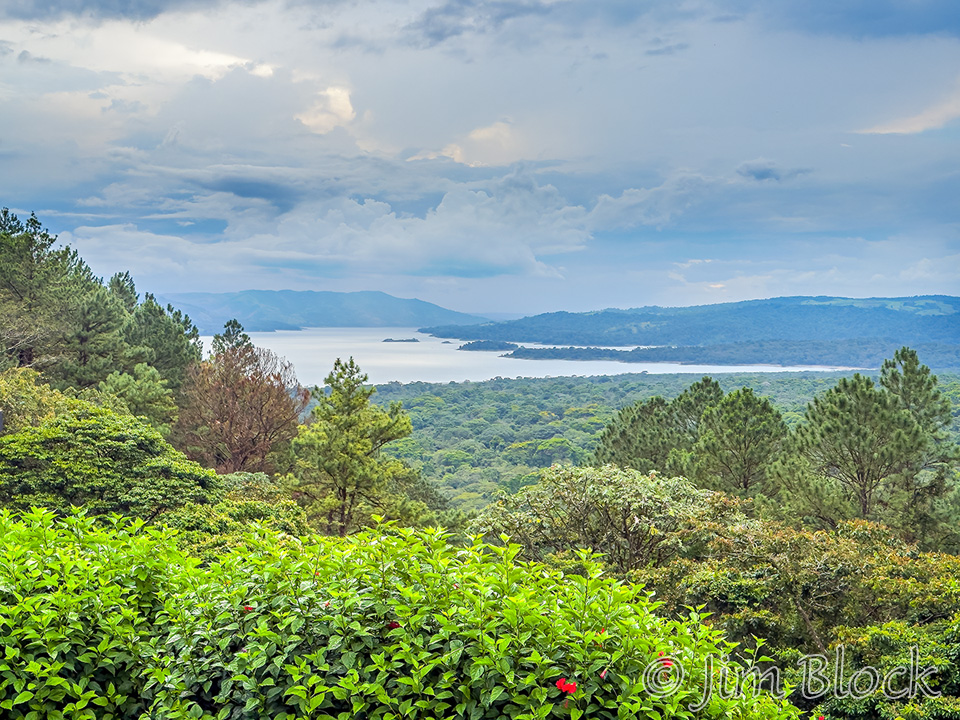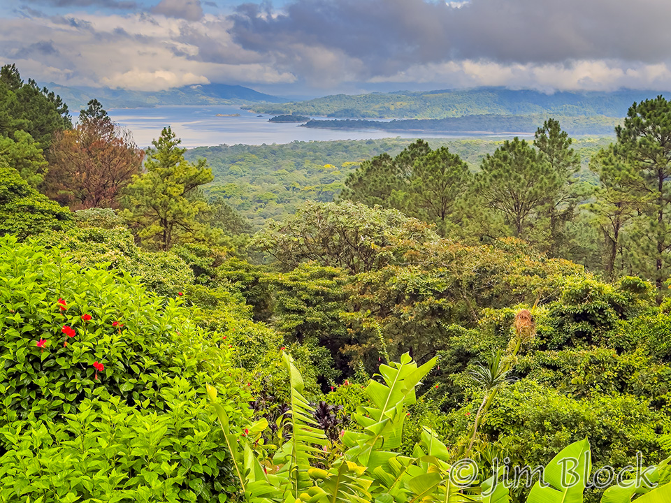 The view from the deck had not changed, but Lake Arenal was still beautiful below a cloud-filled sky in the distance.