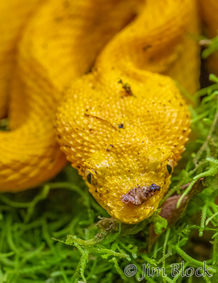 I used my long lens from a safe spot. These snakes are highly venomous.  This one seemed to have a small creature or forest object on its nose.  I could not enlist a volunteer to flick it off for a better photograph.