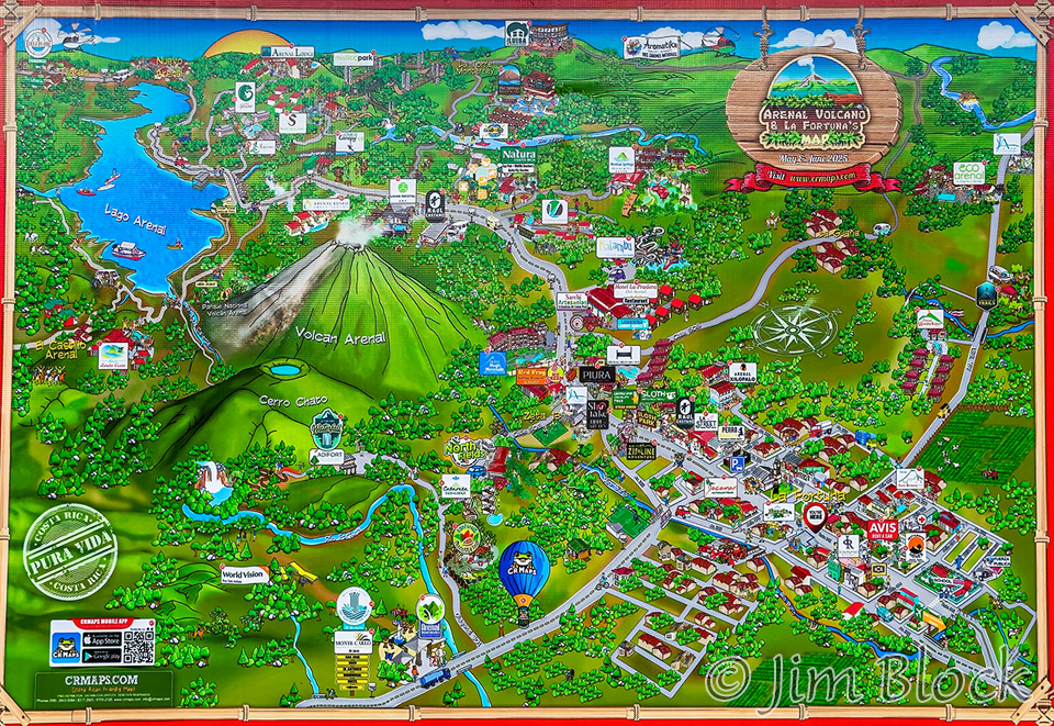 We visited La Fortuna, the city where the Arenal Observatory & Trails Lodge is located, three times: to drop off laundry and have lunch the first day, to pick up laundry and have lunch the second day, stop for coconut water and to visit a family the third morning. Here is a poster that was in a central square.
