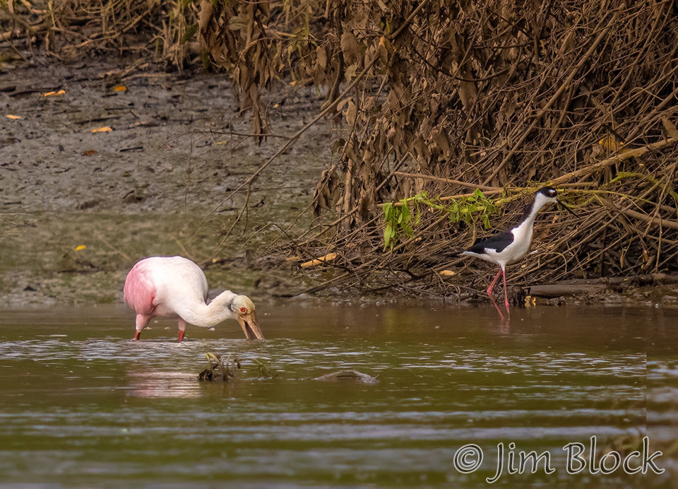 A Roseate Spoonbill and Black-necked Stilt grazed on a distant beach.