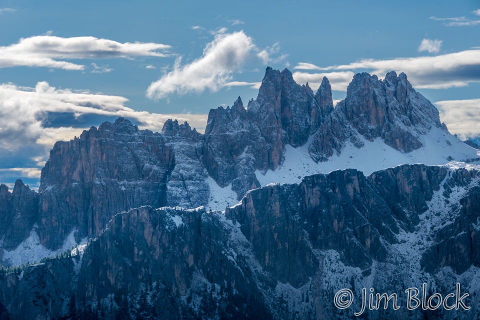 Cortina can be seen at the very left edge of the photo below. Above and to the right a bit is Sorapiss. To the right of that are the jagged peaks of Croda da Lago and the mastiff of Lastoi de Formin.
