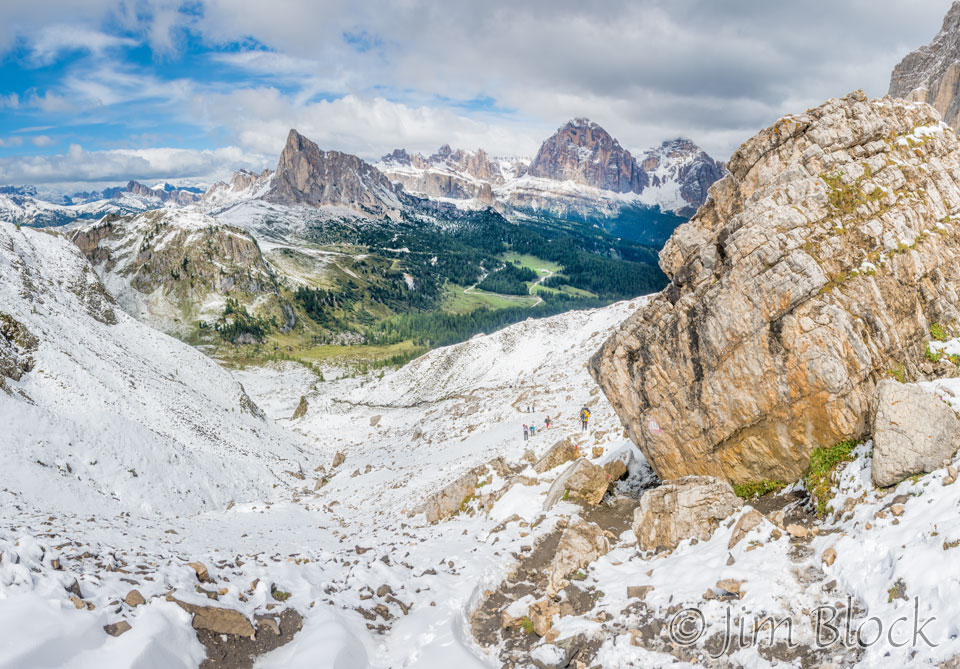 The 4-shot panorama below shows us descending. Rifugio Lagazuoi is at the peak to the far left. At the right hand side is Tofana.
