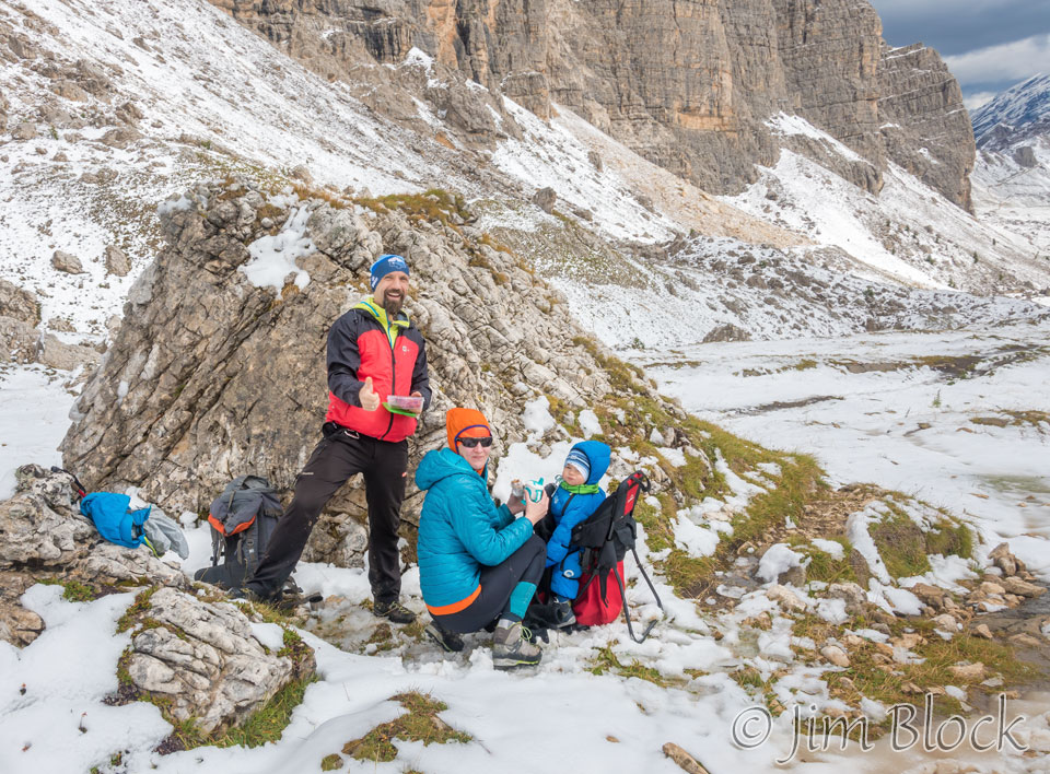I met a young couple feeding lunch to an infant. Although we did see some young children at some of the rifugios, I believe they all arrived there by car. This child was clearly on a hike.