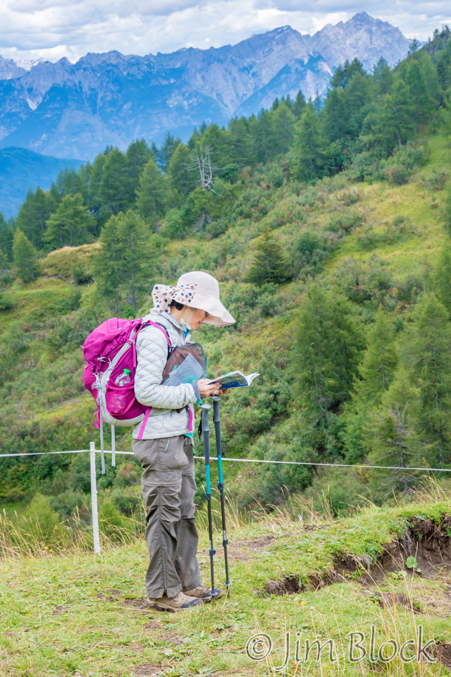 I made a whimsical 18-photo panorama that shows Young twice heading to Passo Giau. Here is that panorama followed by the two halves of it.