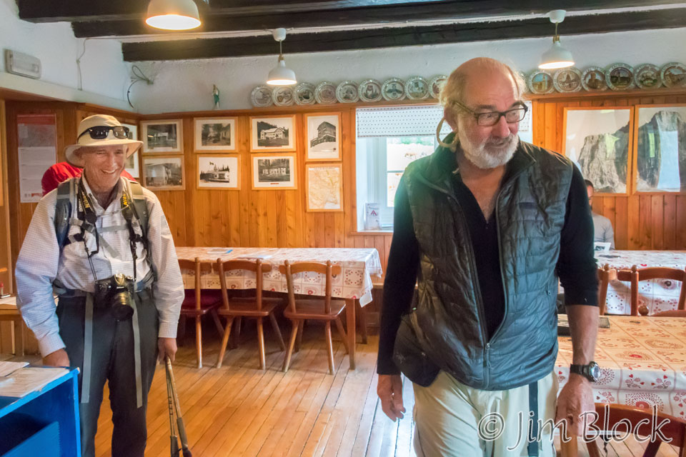 Jim Gold was already at the rifugio waiting for us. I got there a bit before Stephen. Here is Stephen entering the rifugio then later enjoying his photos with Jim.