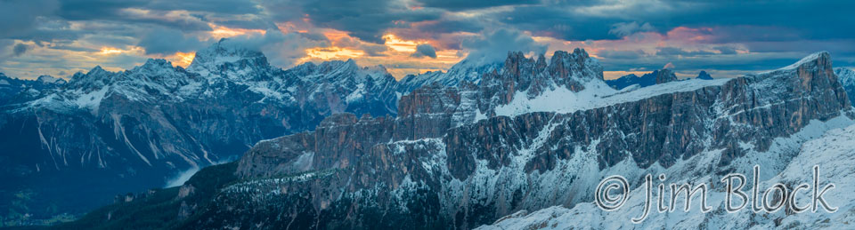 The sky was starting to light up so I made a 14-photo panorama looking to the east with Cinque Torri, Cortina, and the peaks of Croda da Lago in the image.