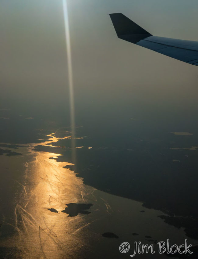 The photo on the right shows the Massachusetts coast shortly after takeoff. You might be able to see the wakes of boats below.