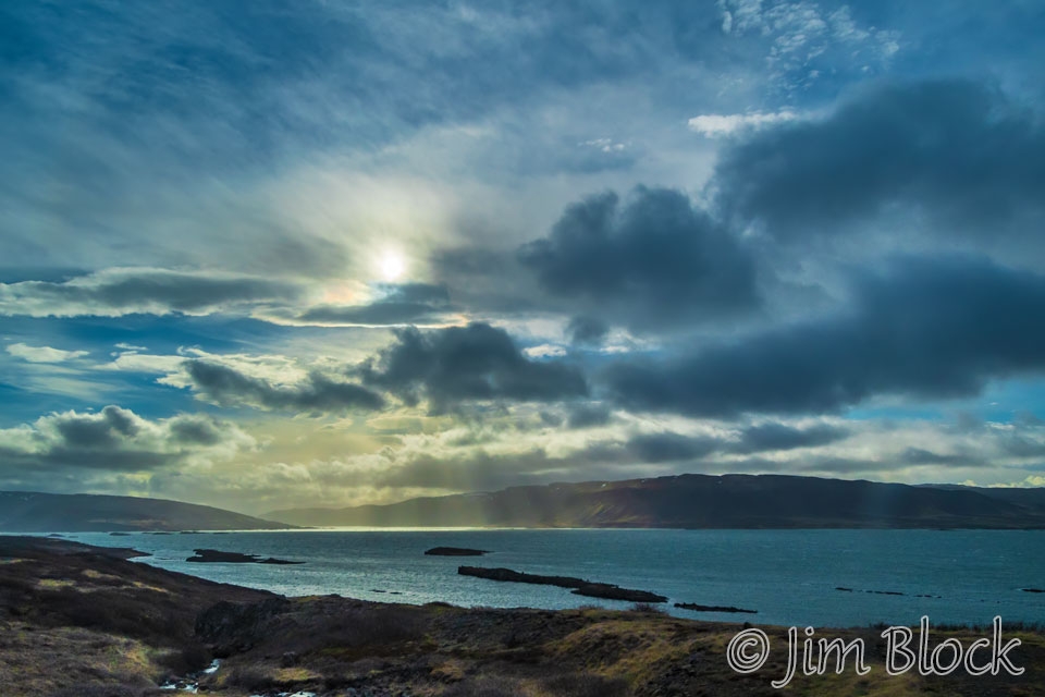 We headed to Garður. As we approached, there was a lot of drama in the sky across the water to the northeast a bit before 7 AM. The photo below shows Reykjavík in the distance. I believe the tallest building is the concrete church, Hallgrímskirkja.