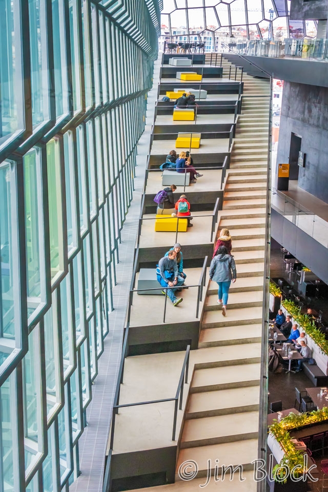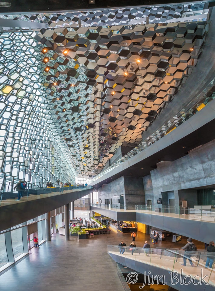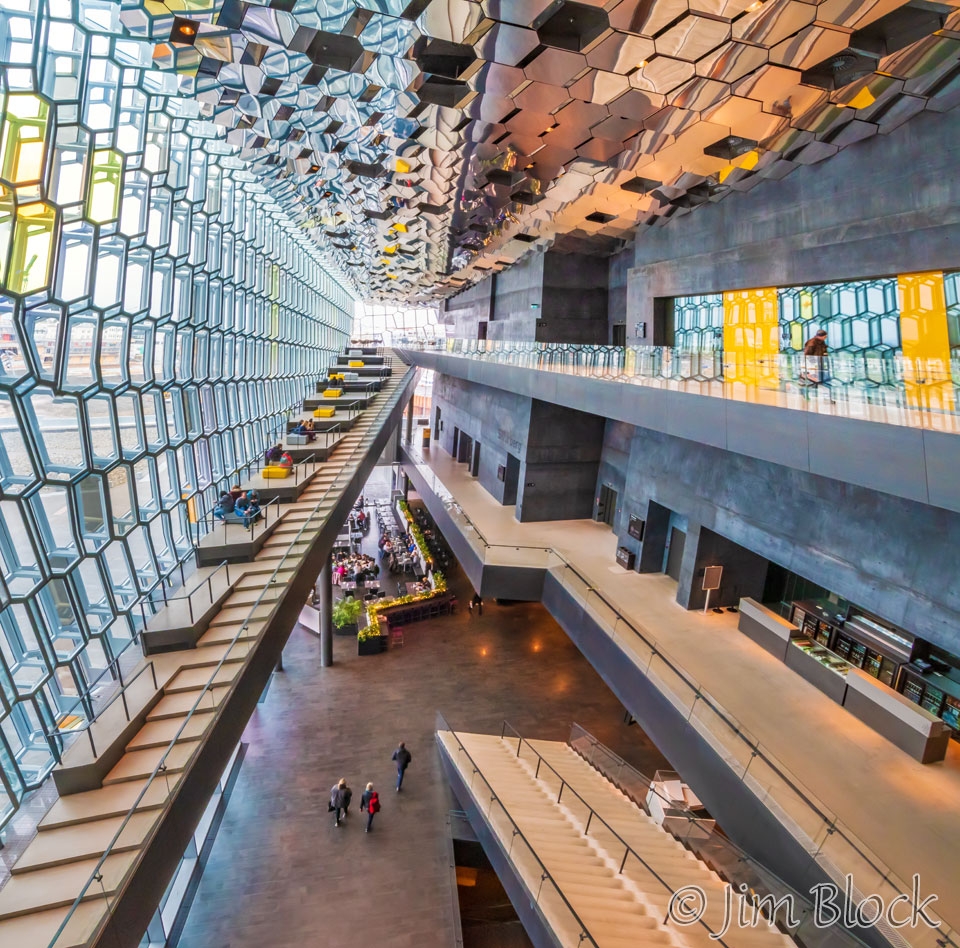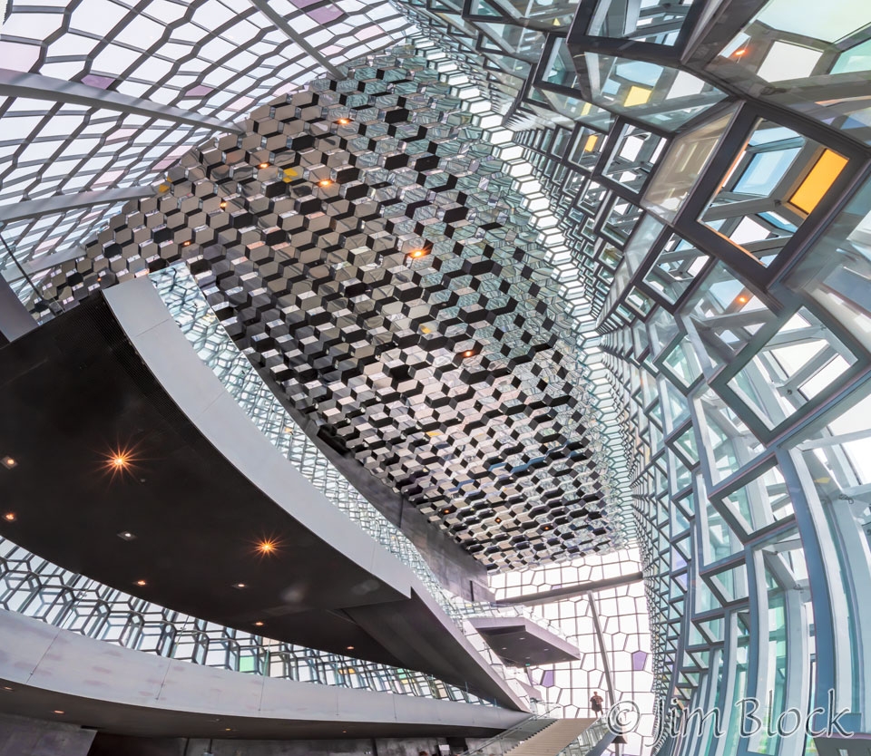 The 16-photo panorama below shows a very distorted view of the inside of the Harpa, an amazing building.