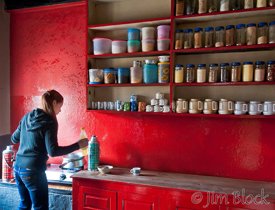 We stopped at a small restaurant for tea, coffee, and baked sweets. The sherpas took considerable interest in the young woman preparing and serving food.