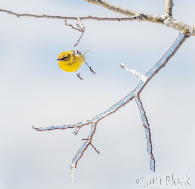 Arriving home shortly after noon, the first bird I saw was “our” Pine Warbler. You can see it surviving an ice storm if you CLICK HERE.  And for the Pine Warbler in a snow storm, please CLICK HERE. As you can see from this photo, ice was still present yesterday afternoon.