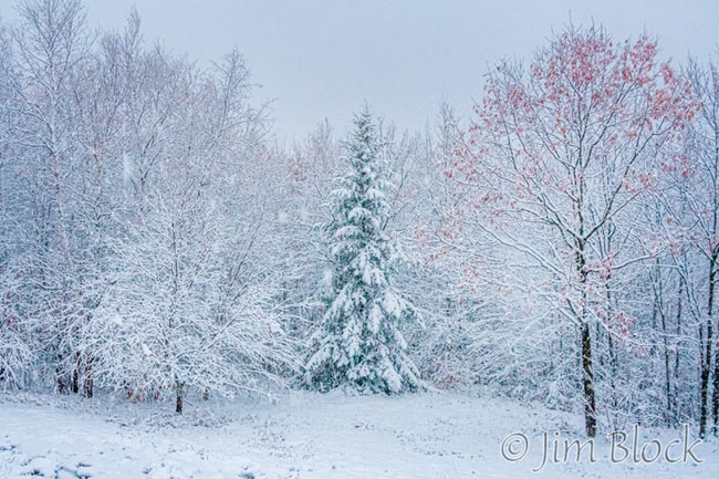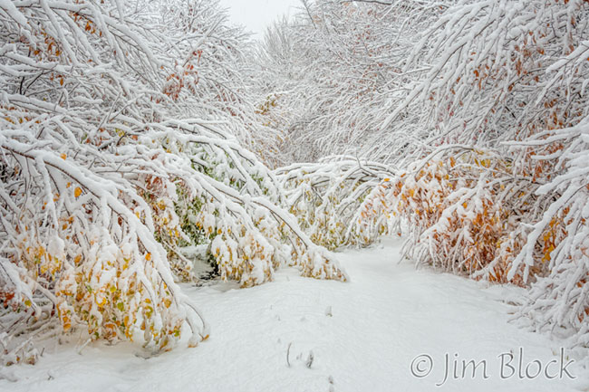 I planned to head out to get some photos of foliage with snow but decided to first walk to the top of our driveway to take a look.  I found it blocked.  I had contracted with Chippers a few weeks before to trim back some of the small trees along our driveway, but it had not yet happened. They came yesterday and did a great job.