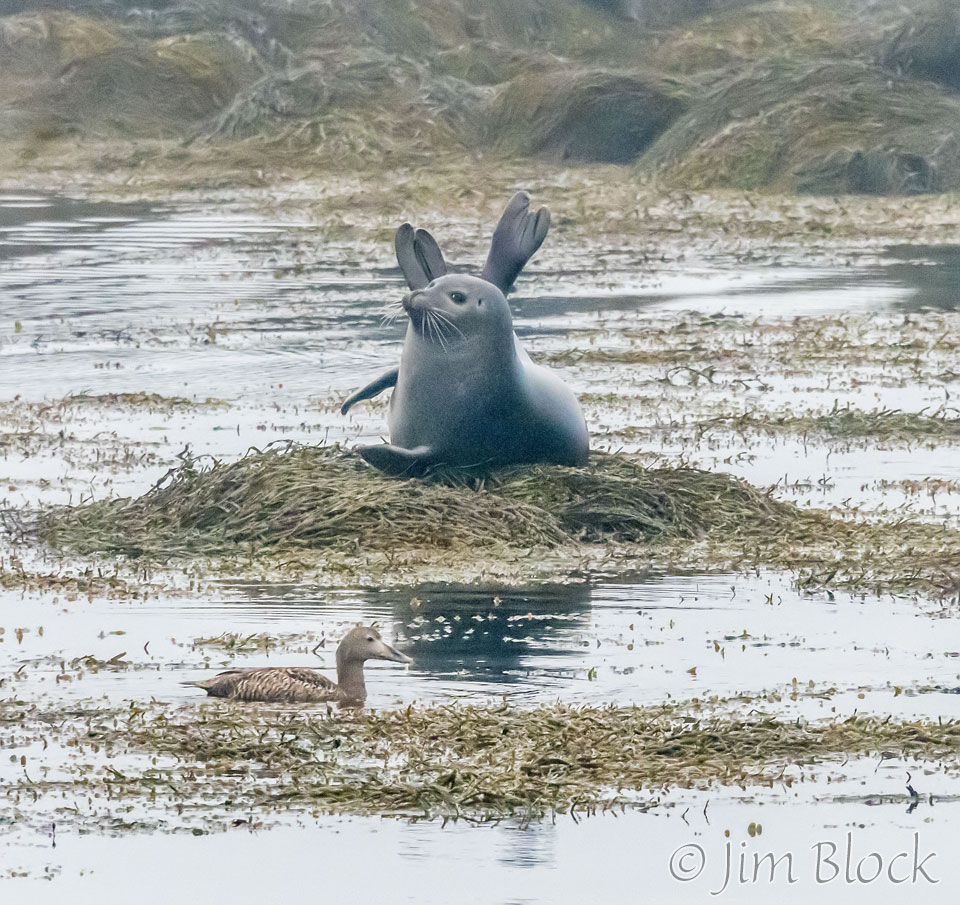 The next morning found us back at the Ytri-Tunga beach. It was again foggy, but I managed to capture a shot of a seal with a female Common Eider swimming in front of it.