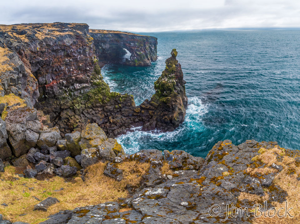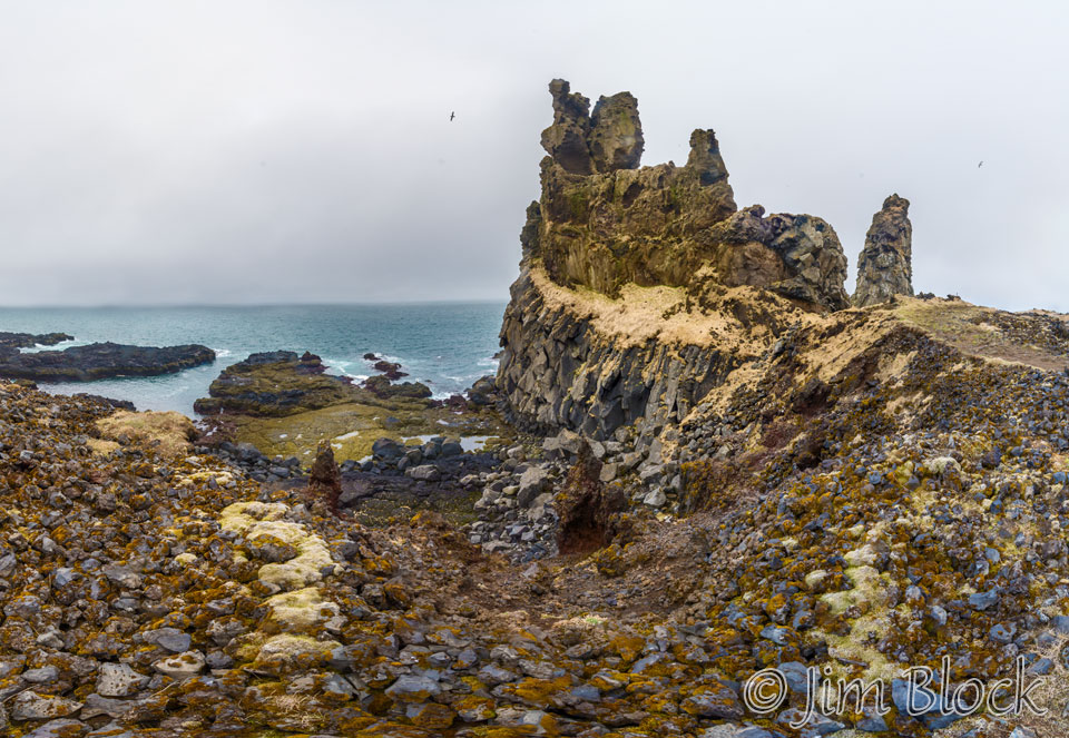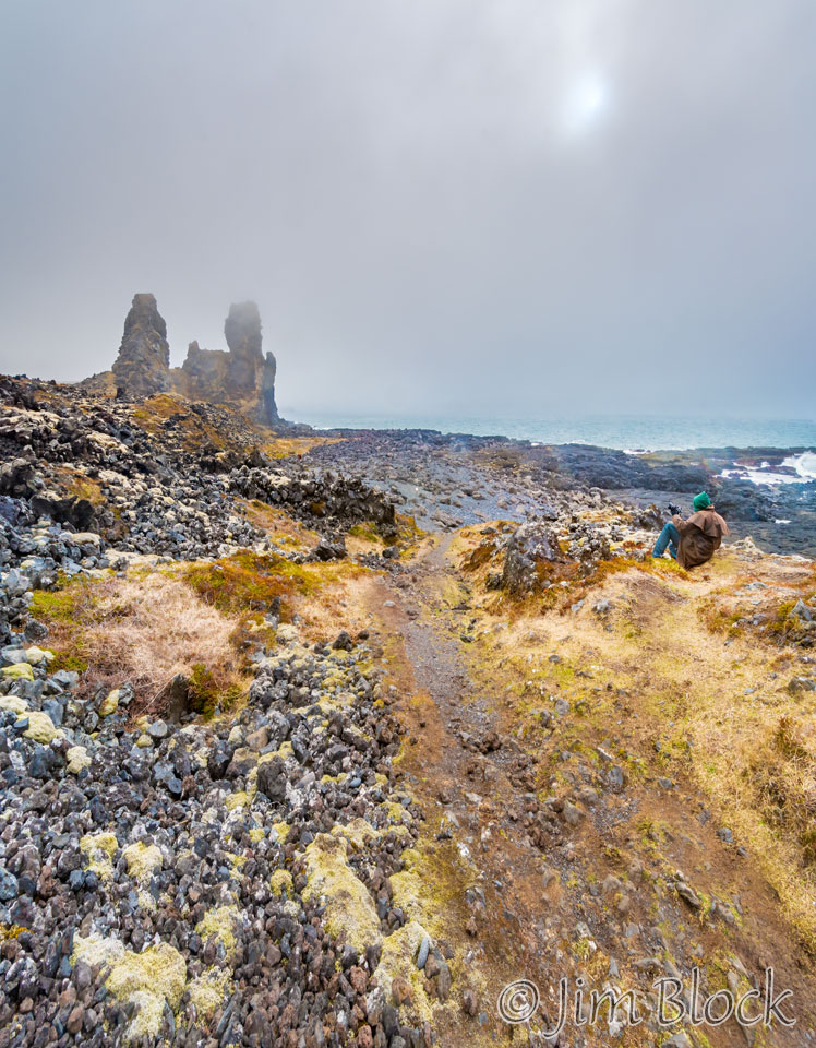 We parked at the rocket-shaped lighthouse at Malarrif and hiked to sea stacks at Londrangar. Here are two views of them.